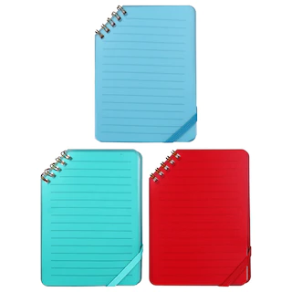 Assortment Details: 5.7×4-in. Jot® Poly Notebooks with elastic assorted among light blue, aqua, and red.