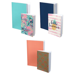Assortment Details: 2-pc. sets of Jot™ Summer Notebooks assorted among 5.75×4.125-in. palm leaf-printed notebooks with matching teal 8.25×5.625-in. notebooks, 5.75×4.125-in. rainbow-printed notebooks with matching coral 8.25×5.625-in. notebooks, and 5.75×4.125-in. pink and white striped notebooks with pineapples reading “hello summer” with matching navy blue 8.25×5.625-in. notebooks.