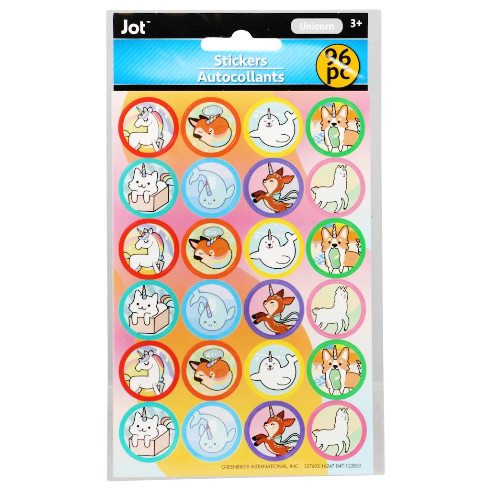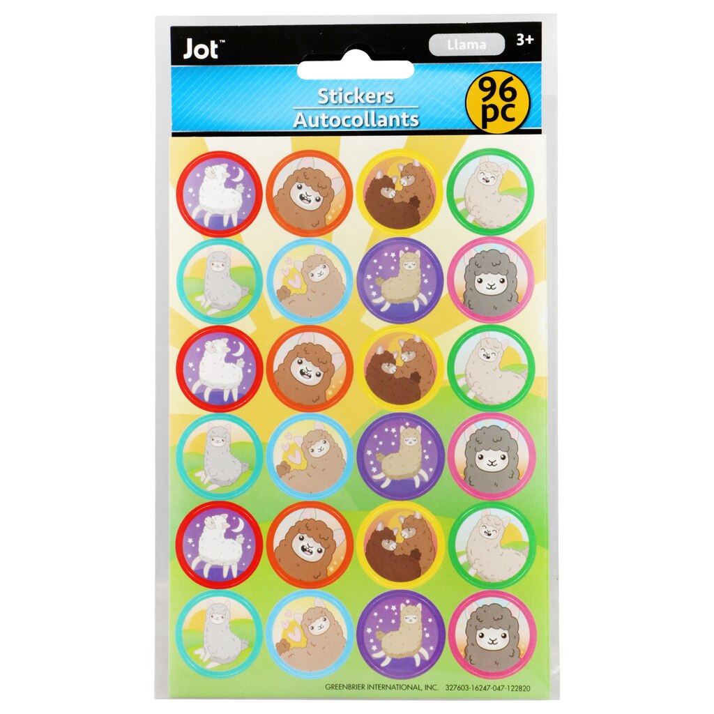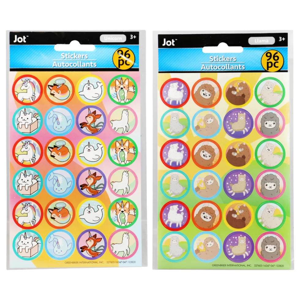 Assortment Details: 4-ct. packs of Jot™ Unicorn and Llama Sticker Sheets including 96 round stickers assorted between unicorn- or llama-inspired designs. Ages 3+.