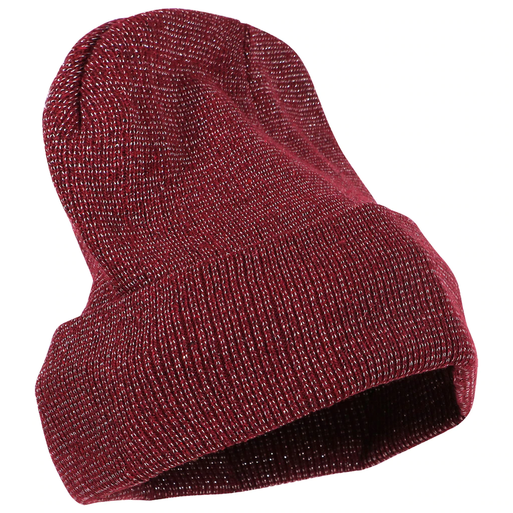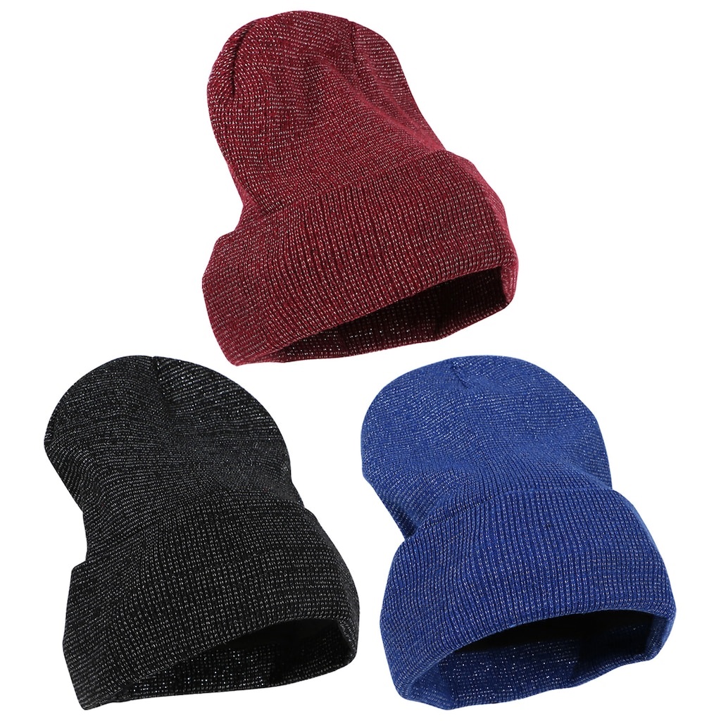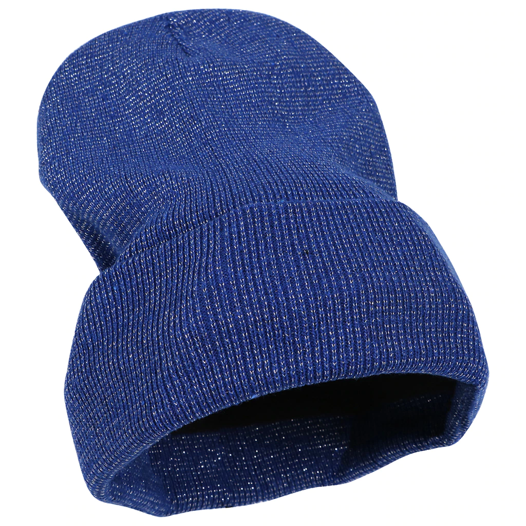 Assortment Details: Fleece-Lined Sparkling Adult-Size Knit Hats assorted among blue, black, and burgundy.