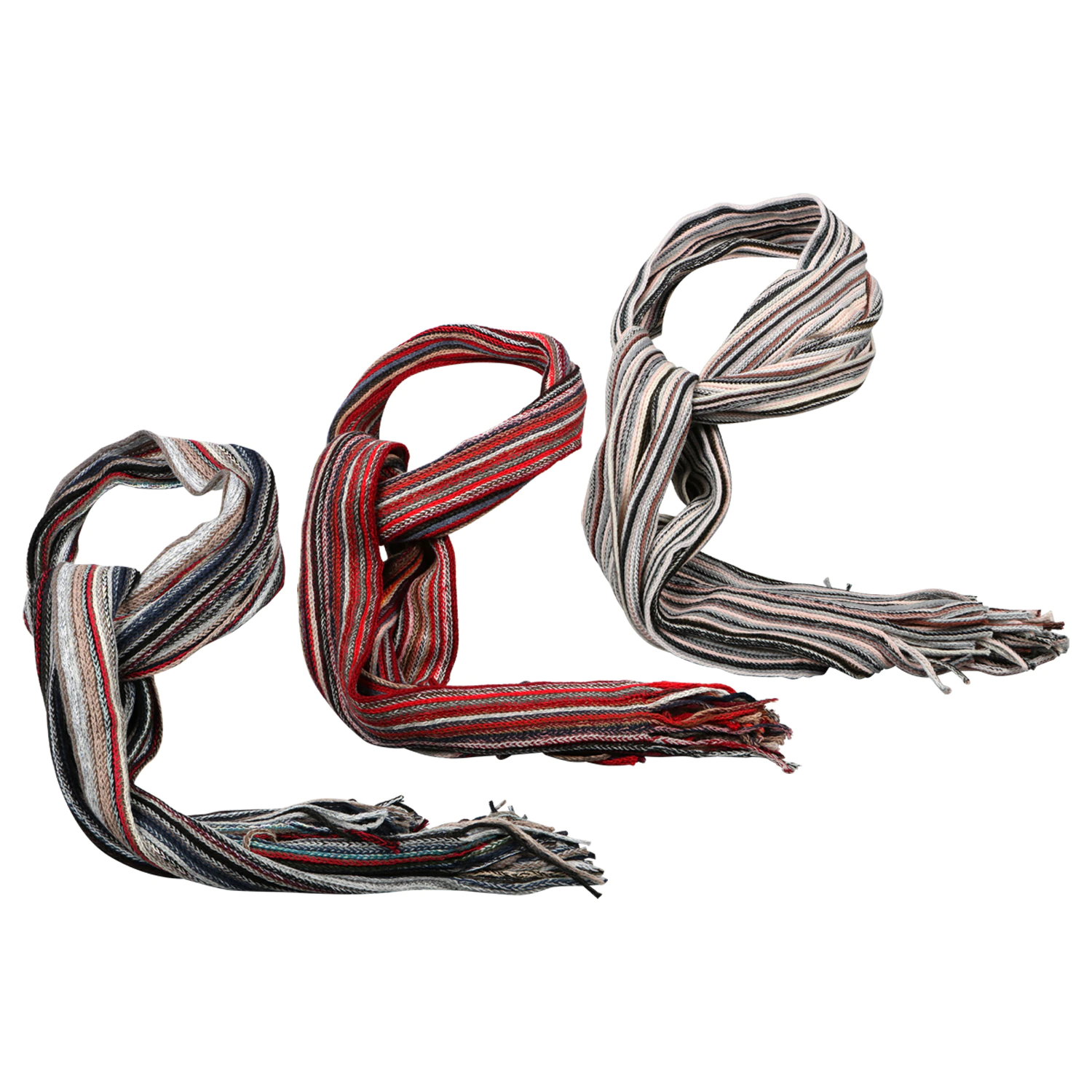 Assortment Details: 72x8x0.10-in. Juncture Winter Adult Fashion Striped Scarves assorted among 11 black-based scarves, 8 gray-based scarves, and 5 red-based scarves.