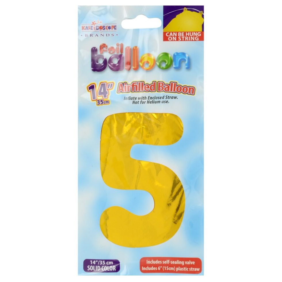 Five has never looked so fabulous! These 14-in. Kaleidoscope Brands® Gold Number 5 foil balloons are perfect for taking your birthday party to new heights! The beautifully shiny golden foil design will liven up your decor and instantly put your guests in celebration mode! Simply use the included 6-in. plastic straws to inflate the balloons through their self-sealing valves and hang them from the ceiling or create a phenomenal balloon banner. Plus, they’re great for celebrating anniversaries, reunions, and many other special events. Not for helium use.