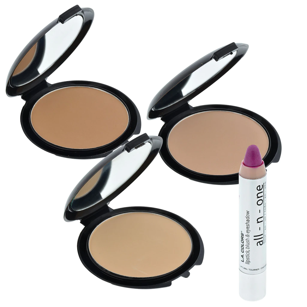 Assortment Details: L.A. Colors® Expressions All-N-One Cosmetic Pencils and Pressed Powders assorted among beige, tan, and nude pressed powder and pink satin all-n-one lipstick, blush, & eyeshadow pencils.