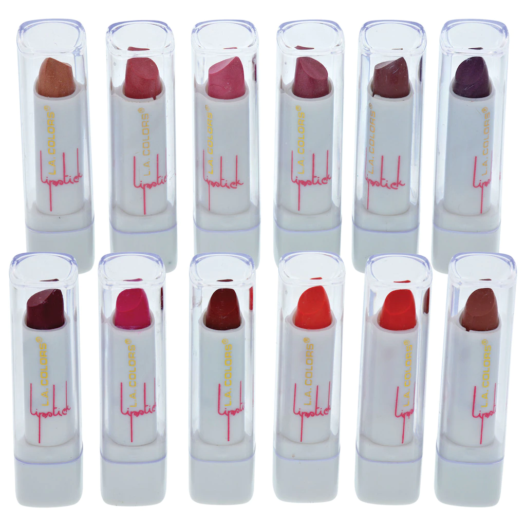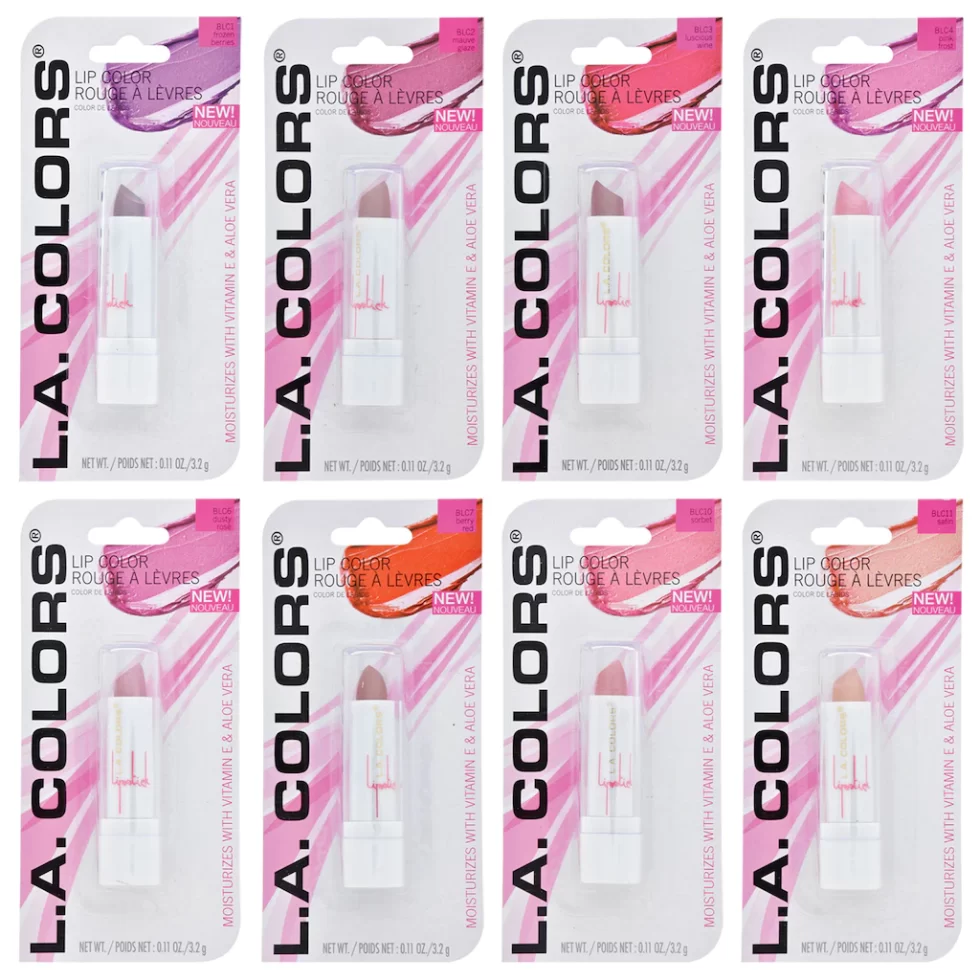 Assortment Details: L.A. Colors® Expressions Lip Colors assorted among frozen berries, mauve glaze, luscious wine, pink frost, berry ice, dusty rose, berry red, cocoa shimmer, lilac frost, sorbet, cherry red, and satin shades