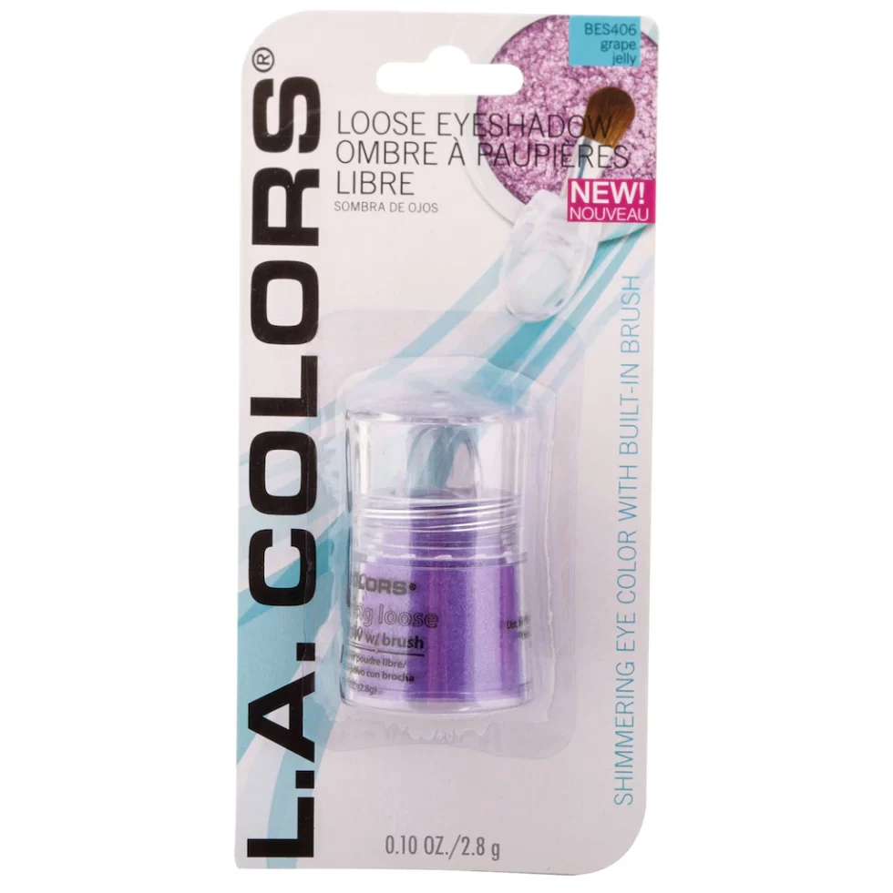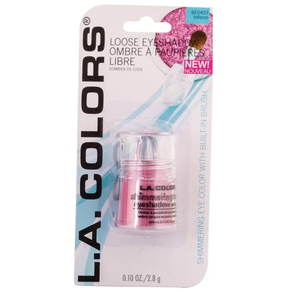 Assortment Details: L.A. Colors® Expressions Shimmering Loose Eyeshadows with Built-In Applicator Brushes assorted among colors of snow white, honeysuckle, sunshine, lollipo, radiant, and grape jelly.