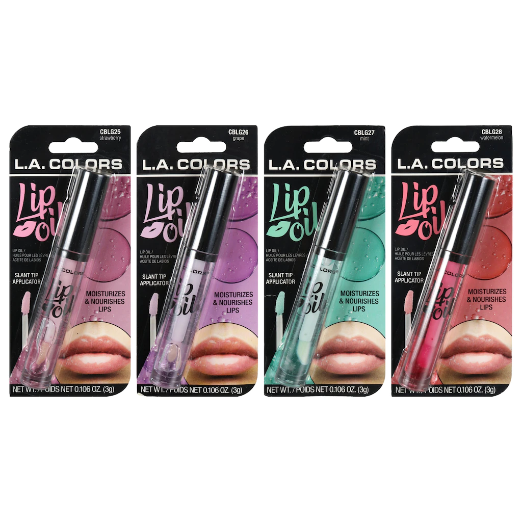 Moisturize and nourish your lips with L.A. Colors® Lip Oil! Each 0.106-oz. tube features a slant tip applicator for precision and comes assorted among strawberry, grape, mint, and watermelon. Whether you use these oils on their own or on top of your lip color, they are perfect for keeping in your purse or bag, gifting to friends and family, and including in prize boxes!