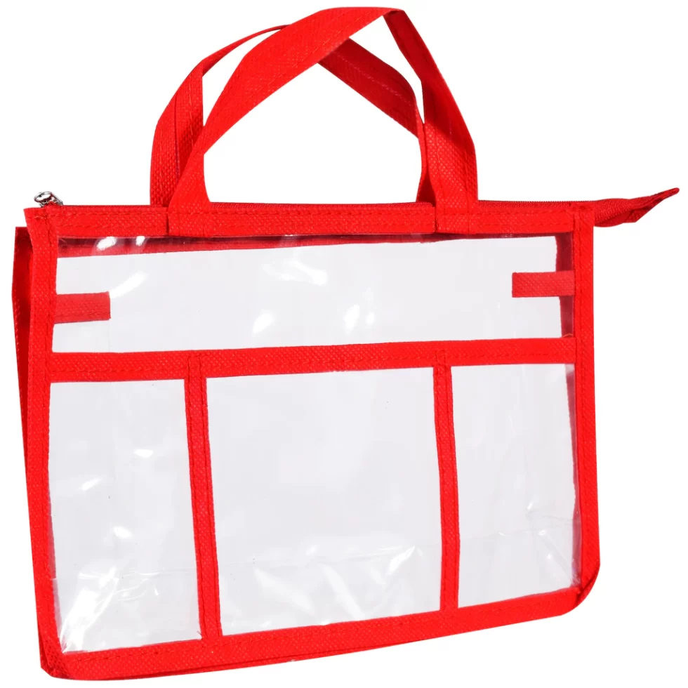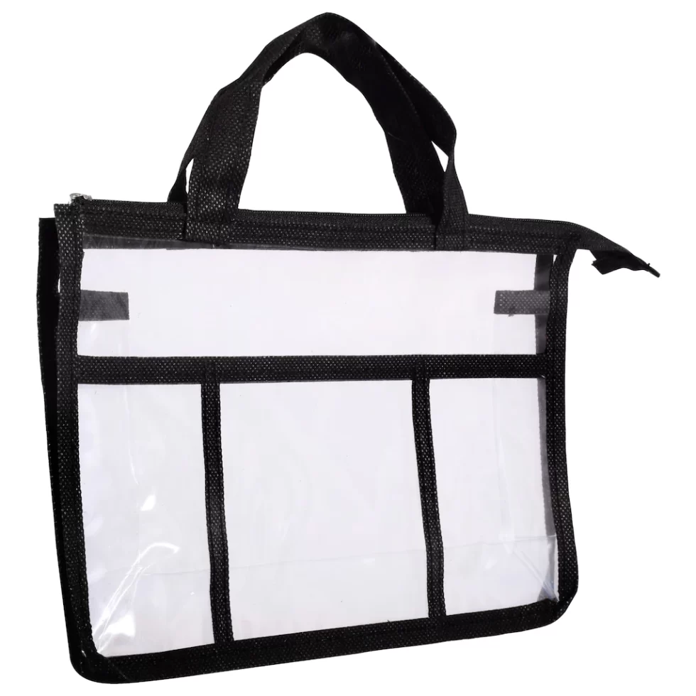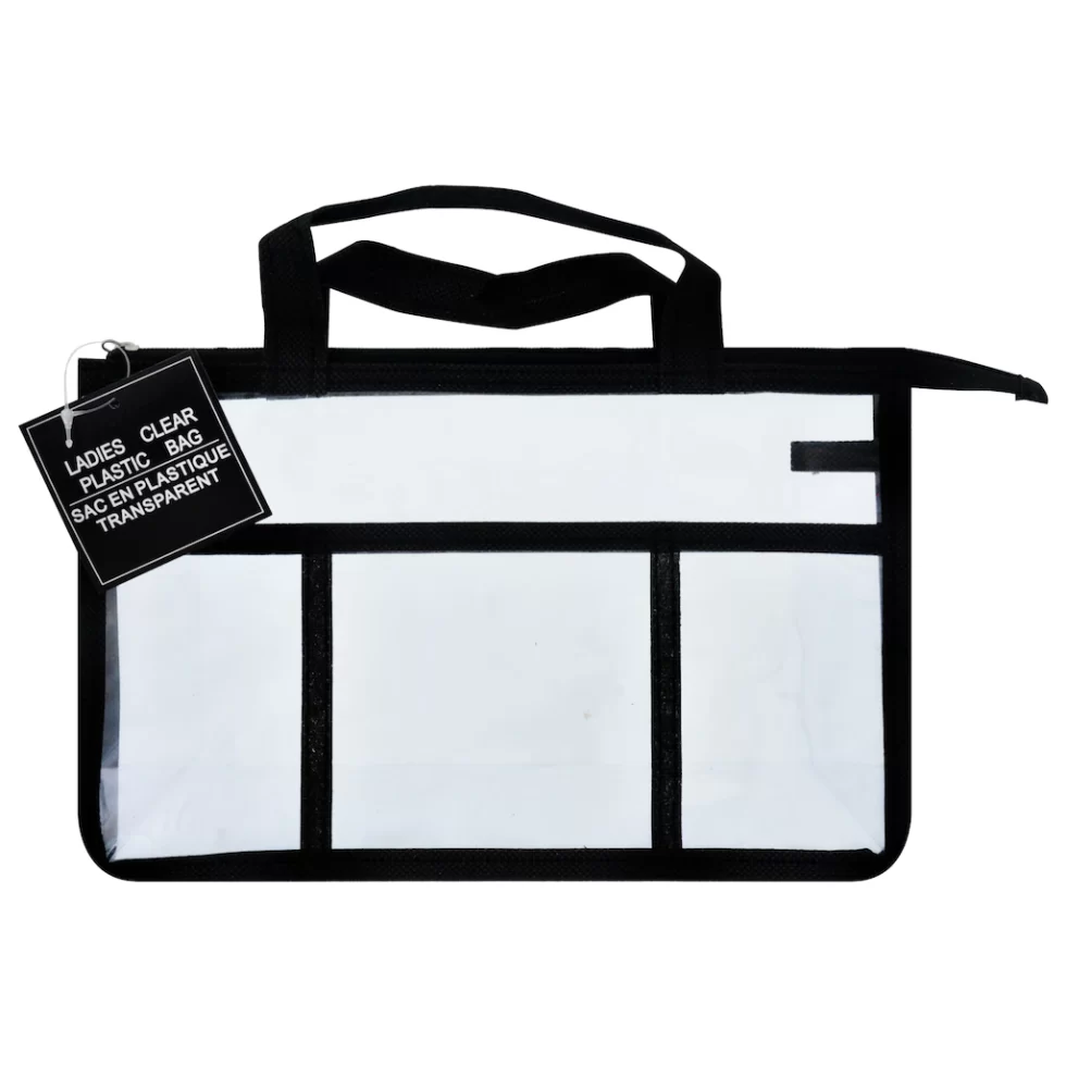 Assortment Details: 9×7-in. Ladies’ Clear Plastic Reusable Carrying Bags assorted between black and red