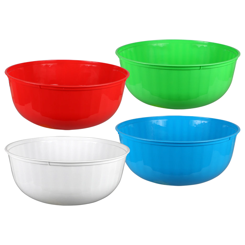 Assortment Details: 12-in. Large Colorful Plastic Bowls assorted among red, white, blue and green