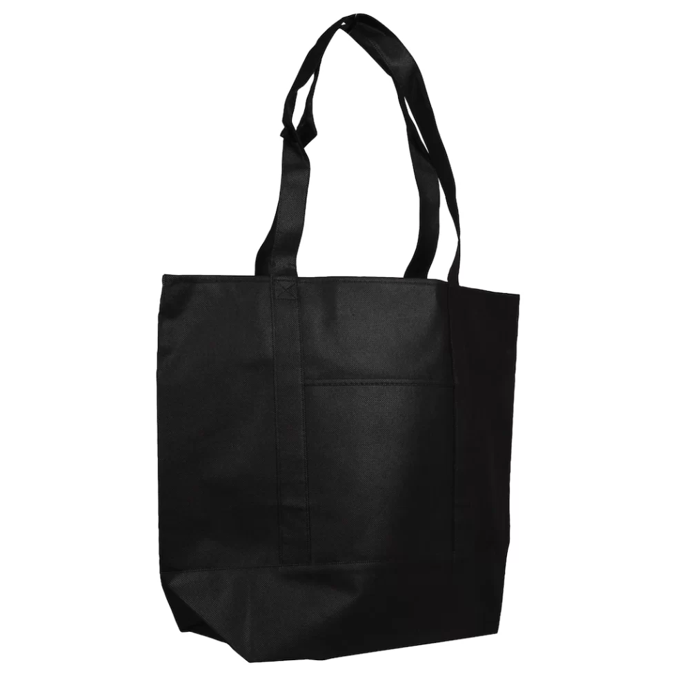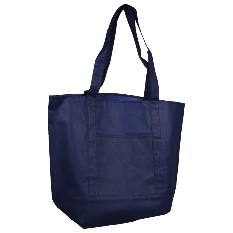 A versatile tote fit for any cargo or occasion. You can say goodbye to plastic too because they’re reusable! Large 18.875x7x15.375-in. tote bags are assorted among 3 solid colors: navy blue, black, and peach. Make this your purse, backpack, diaper bag, laptop bag, gym bag, and more.