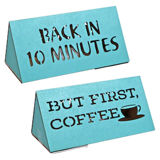 Assortment Details: 5.9×3.15×2.76-in. LED Desk Wood Signs assorted among “Today Will Be Awesome,” “Chasing Unicorns,” “Pretending to Work,” “Back in 10 Minutes,” “But First Coffee, ” and “Out of Office.”