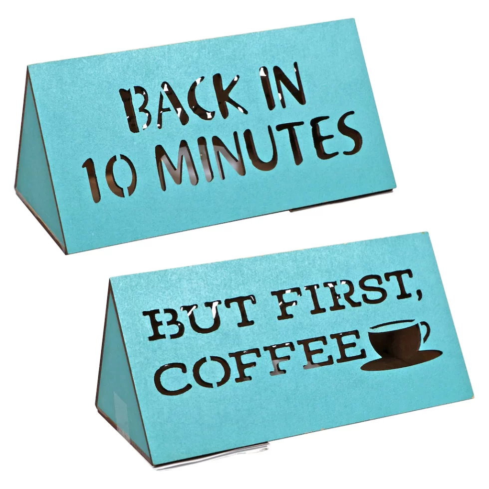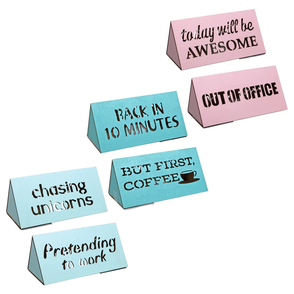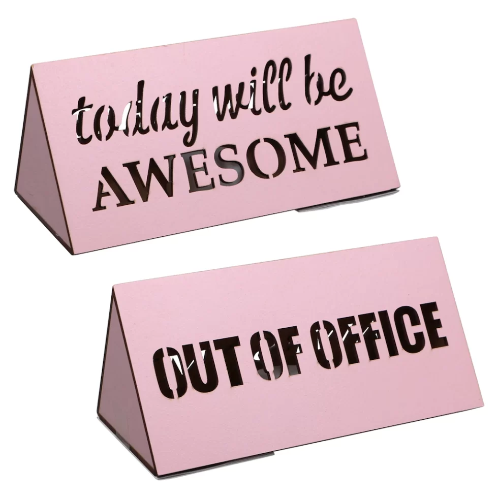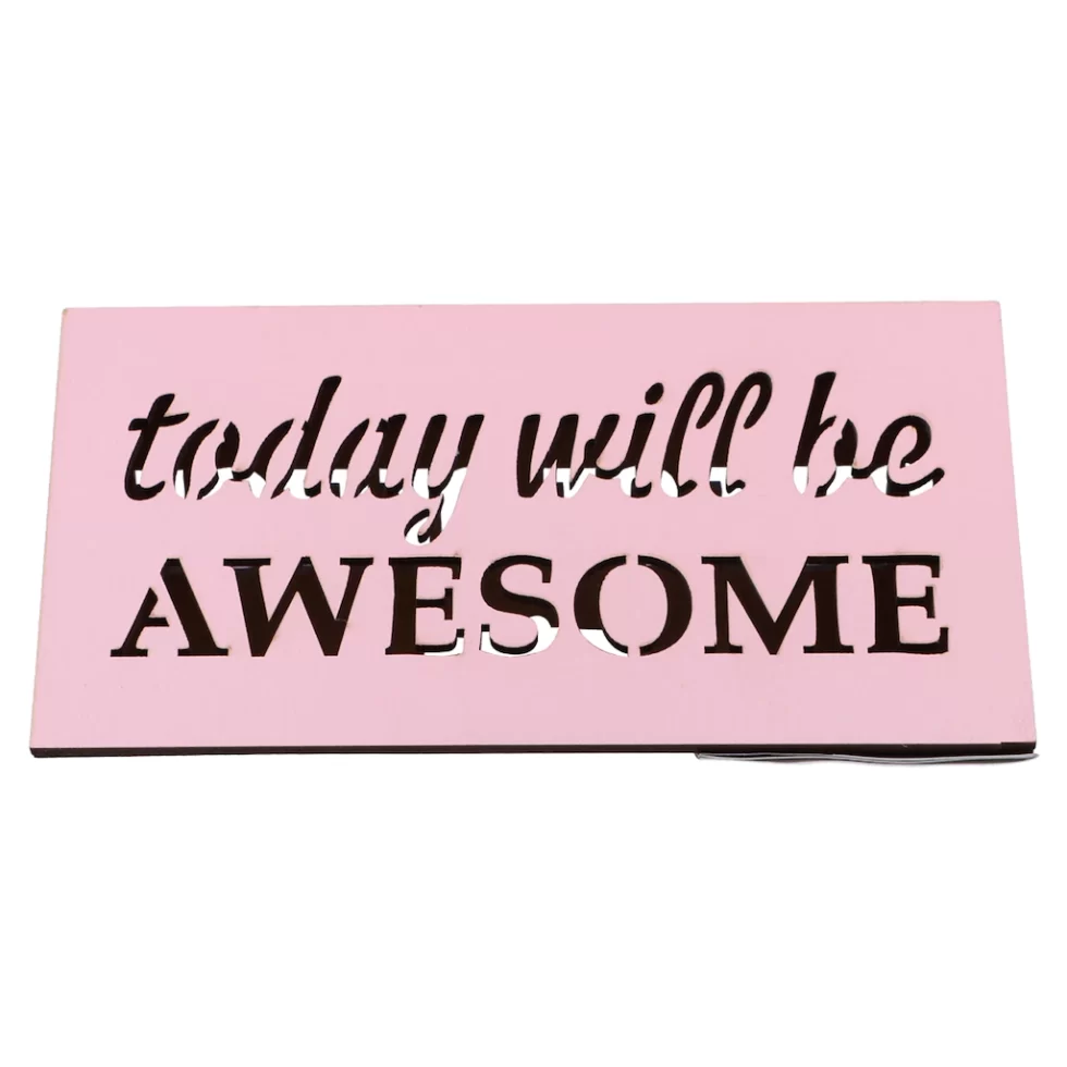Assortment Details: 5.9×3.15×2.76-in. LED Desk Wood Signs assorted among “Today Will Be Awesome,” “Chasing Unicorns,” “Pretending to Work,” “Back in 10 Minutes,” “But First Coffee, ” and “Out of Office.”