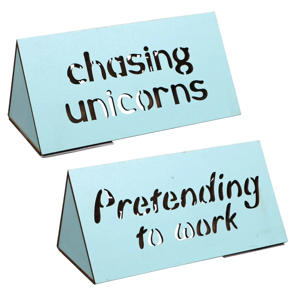 These LED Desk Wood Signs, with yellow lights that are operated with an on/off switch, add personality to any desk. The lights are powered with 3XLR44 batteries that are included. They are assorted among “Today Will Be Awesome,” “Chasing Unicorns,” “Pretending to Work,” “Back in 10 Minutes,” “But First Coffee, ” and “Out of Office.” These bring fun to any office and make great gifts and stockiing stuffers.