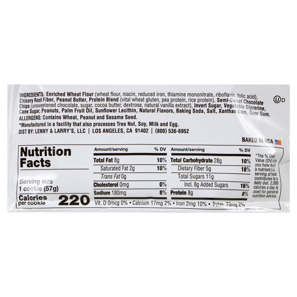 These plant-based cookies are packed with 5 grams of fiber and 8 grams of protein per serving! Lenny & Larry’s® The Complete Cookie®: Peanut Butter Chocolate Chip cookies are also verified non-GMO and vegan. These 2-oz. packs are ideal for nutrition on the go — great for lunches, gym bags, and more!