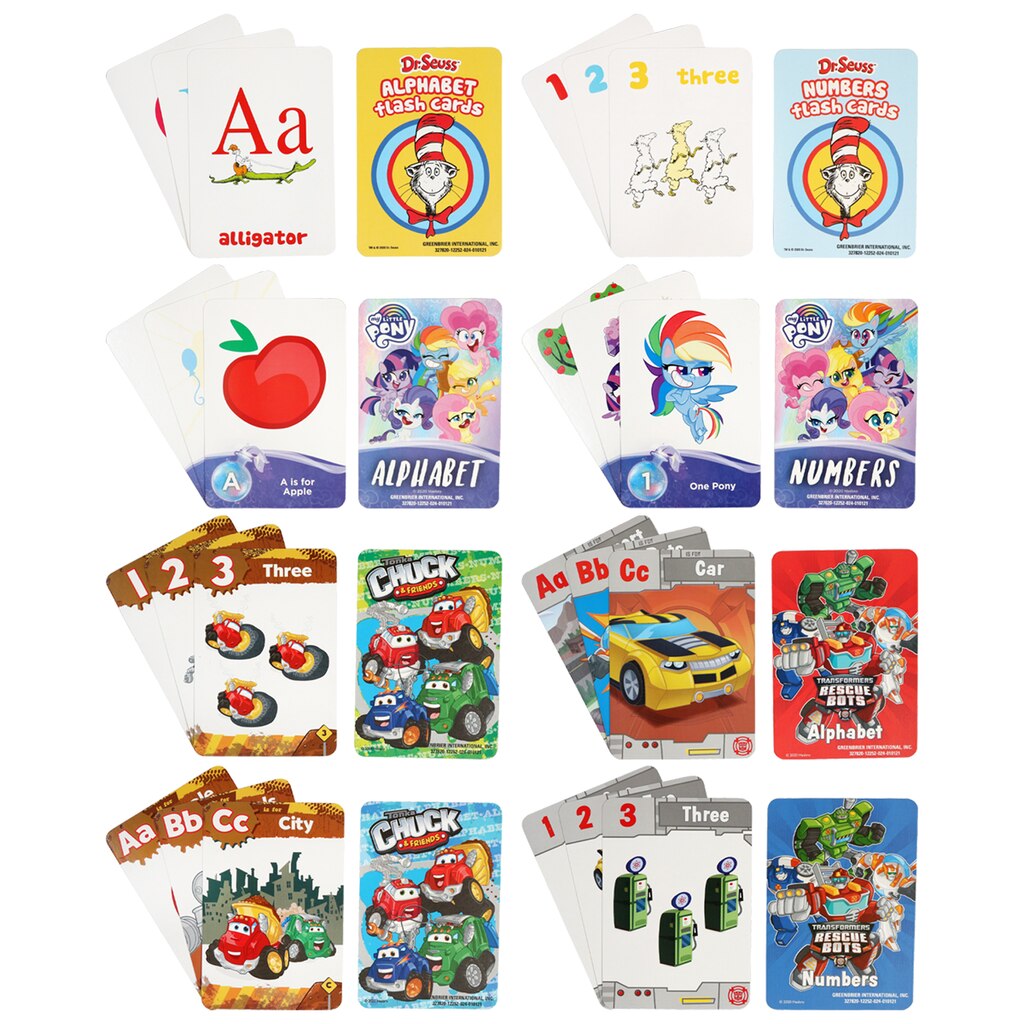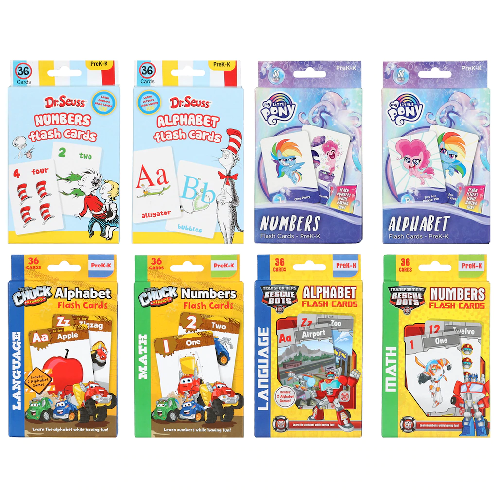Assortment Details: Licensed Character Flash Cards assorted among Dr. Seuss™, My Little Pony™, Transformers™, and Tonka®