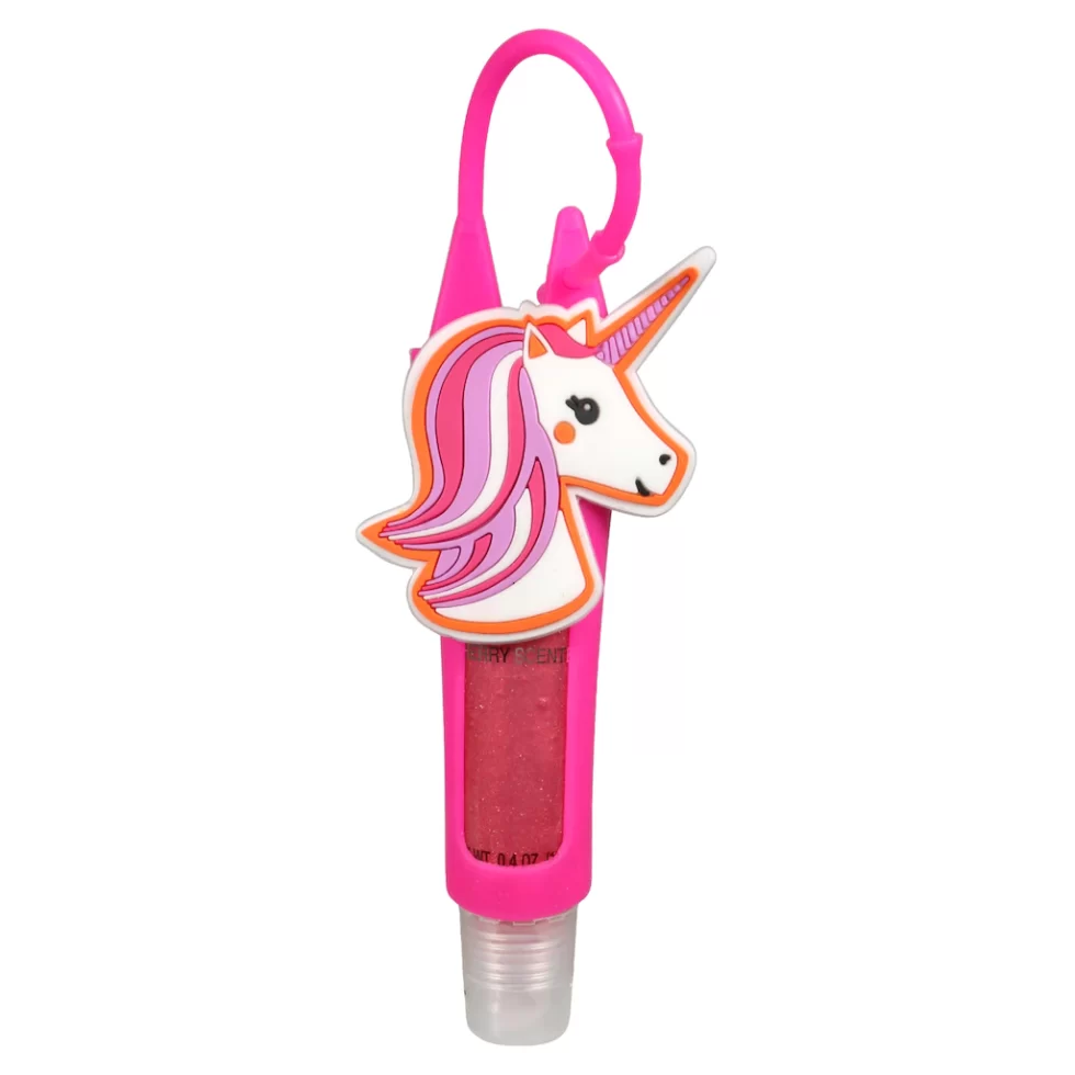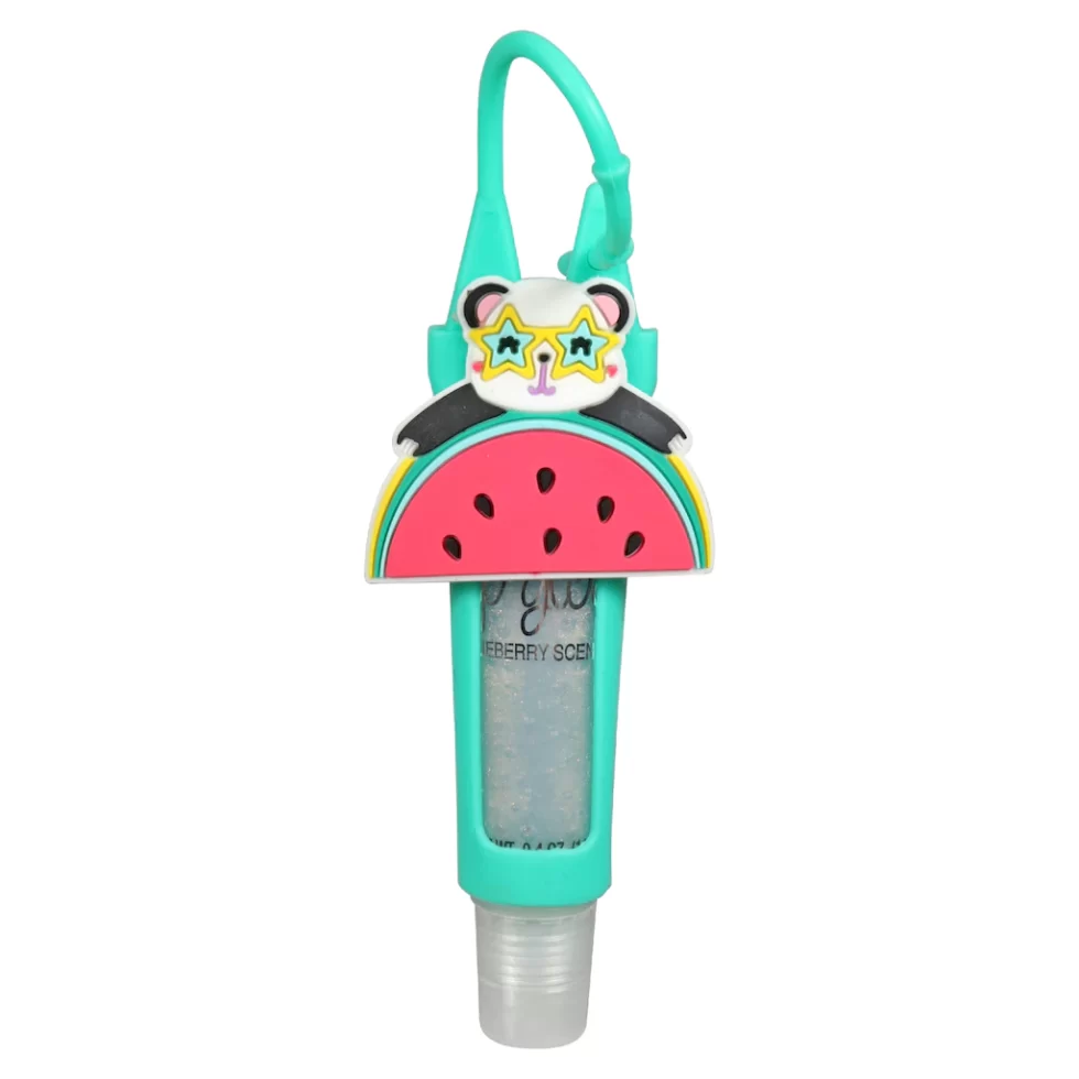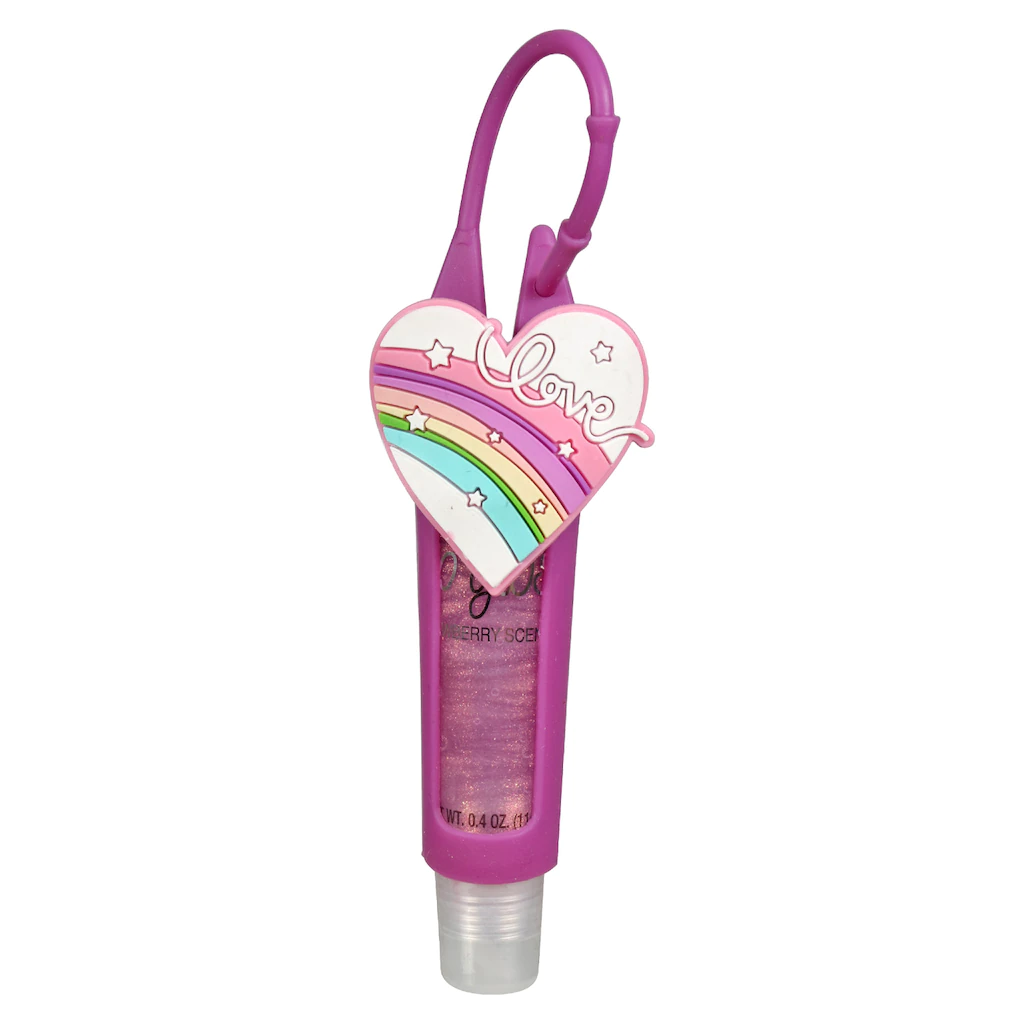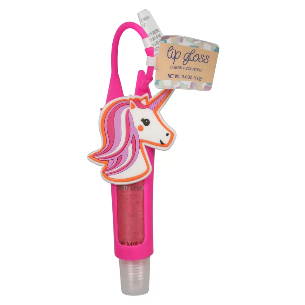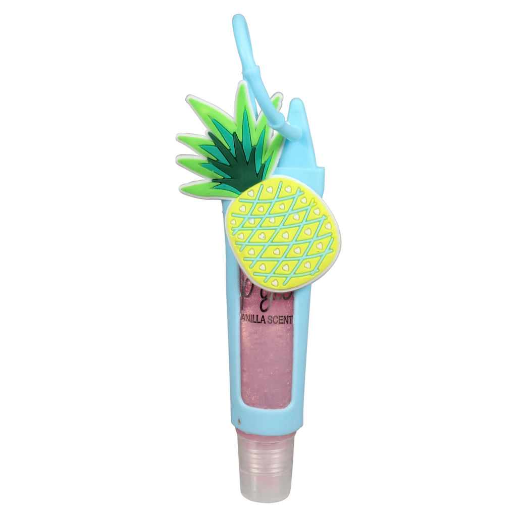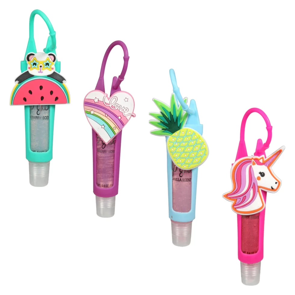 Assortment Details: 0.4-oz. tubes of Lip Gloss with Fun Silicone Holders assorted among cherry-scented with a pink unicorn silicone holder, vanilla-scented with a blue pineapple silicone holder, strawberry-scented with a purple heart silicone holder, and blueberry-scented with an aqua panda watermelon silicone holder.