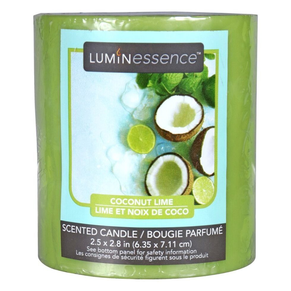 Assortment Details: 2.875×2.5-in. Luminessence® Coconut and Lime Scented Pillar Candles