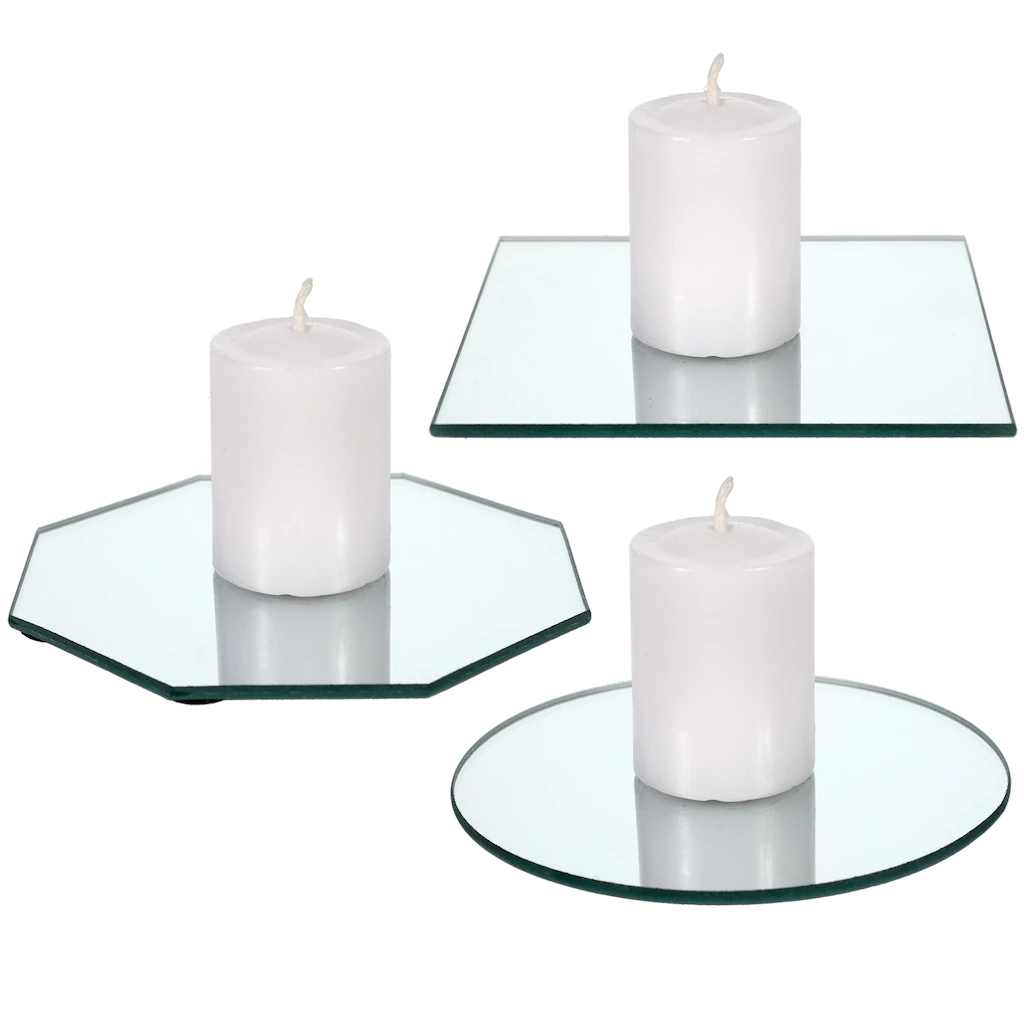 Soft, reflected candlelight sets a romantic ambiance! Place a candle or votive holder on this mirror for a great accent, or use for decorating and craft projects. They all measure 5×5-in. and come assorted among square, octagon, and round shapes. Candles not included.
