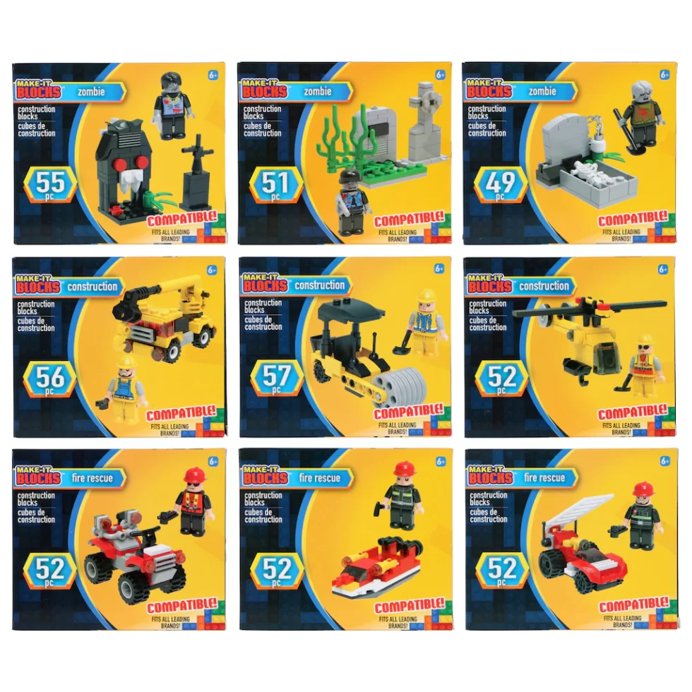 Assortment Details: 49-57-pc. boxes of Make-It Blocks™ Assorted Construction Block Sets assorted among the nine zombie, construction, or fire rescue sets shown. Ages 6+.
