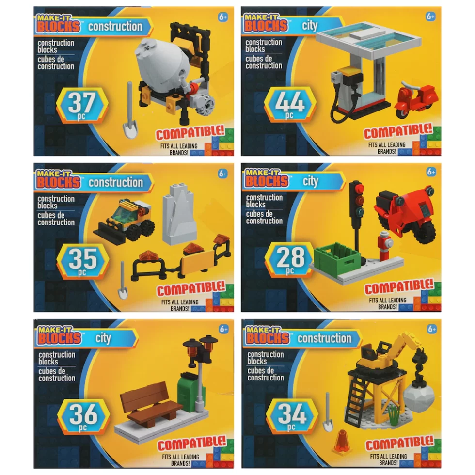 Assortment Details: Make It Blocks™ City Construction Packs assorted among 3 city designs and 3 construction designs