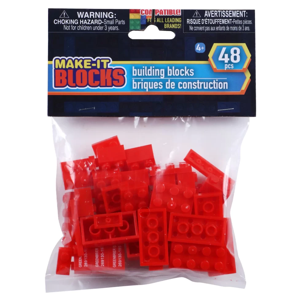 Red building blocks will have kids creating as many creations as they can imagine. 48-ct. packs of Make-It Blocks™ are compatible with all leading building-block brands and are a great way to expand their building block collection without breaking the bank. Ideal for stocking stuffers, party favors at building-block-themed birthday parties, and more.