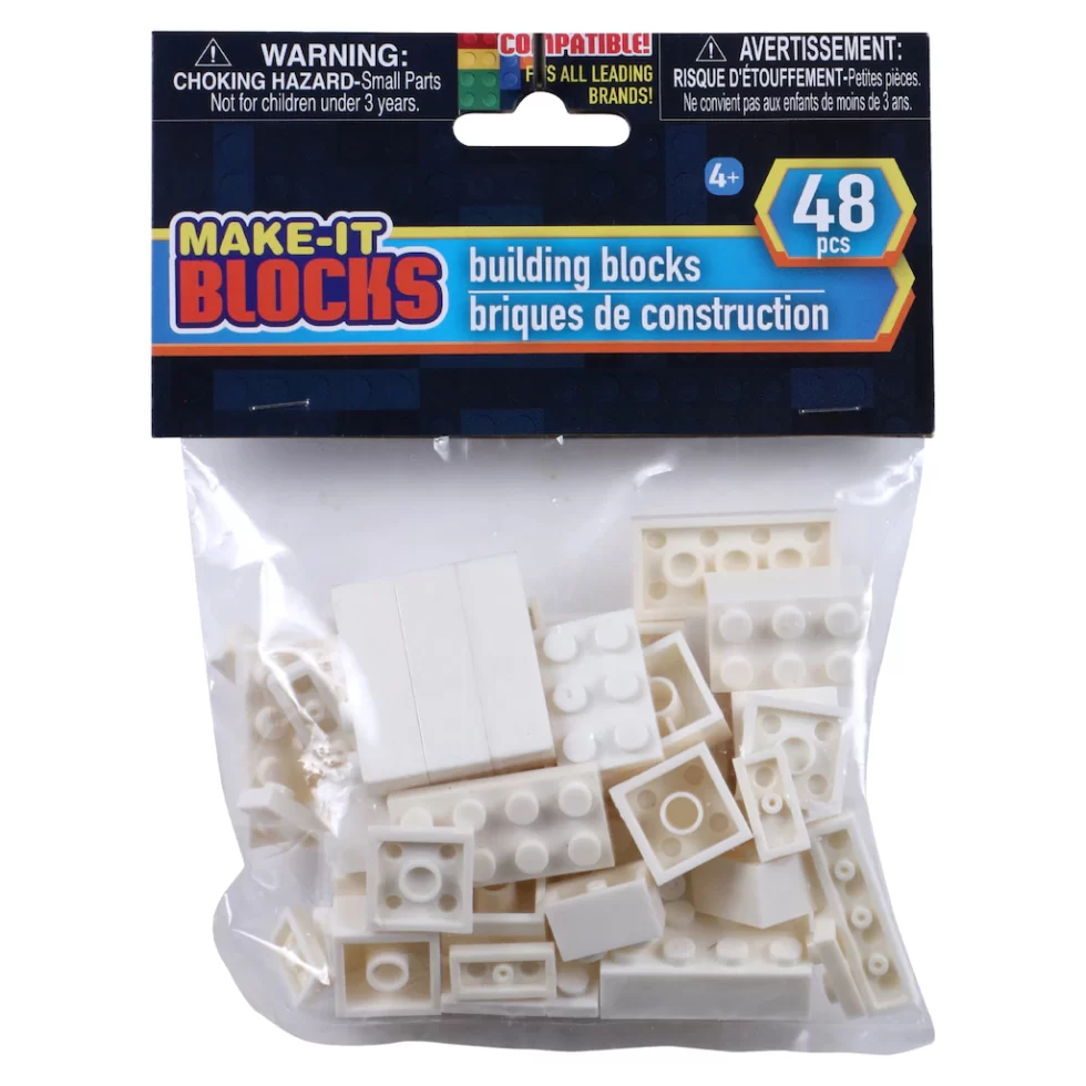Let your imagination run wild one block at a time! White plastic blocks from Make-It Blocks™ come in 48-ct. packs and are compatible with most leading brands, which can help you or your child build all sorts of wonderful creations. They are ideal for stocking stuffers, birthday party favors, school prizes, and much more. Ages 4+.