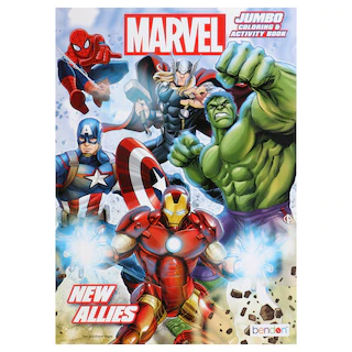 Assortment Details: 80 Pages, Marvel® Superheroes Jumbo Coloring Books assorted among the four styles shown featuring Marvel® characters The Hulk, Captain America™, Iron Man, Spider Man®, Black Panther, Iron Man and DC Comics® Woman Woman®