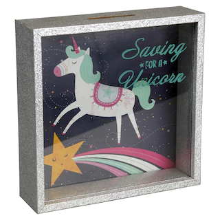 These MDF inspirational glitter money banks are shadow box frames that are assorted among 4 designs. They are a fun way to set aside funds for any goal. Ok, so maybe it isn’t for a unicorn, but you’re the only one who needs to know that! Use them to save for a trip, a purchase, a gift, and more. There is a slot in the top for coins and dollar bills. It comes with hanging hardware for hassle-free display to hang flat against the wall, but it can also be displayed on shelves, desktops, tabletops and mantels. .
