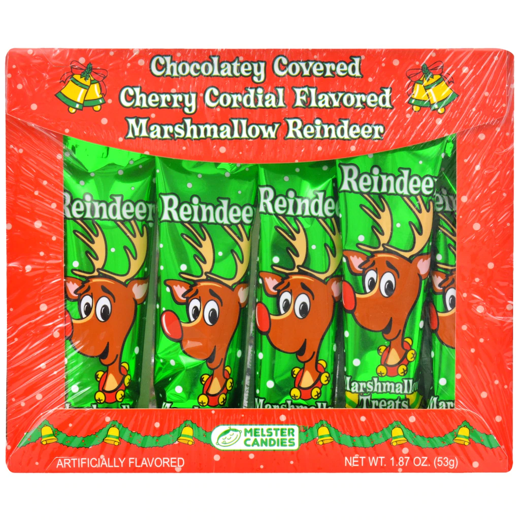 Assortment Details: 5-ct. Packs of Melster™ Chocolatey Cherry-Cordial-Flavored Reindeer Marshmallows