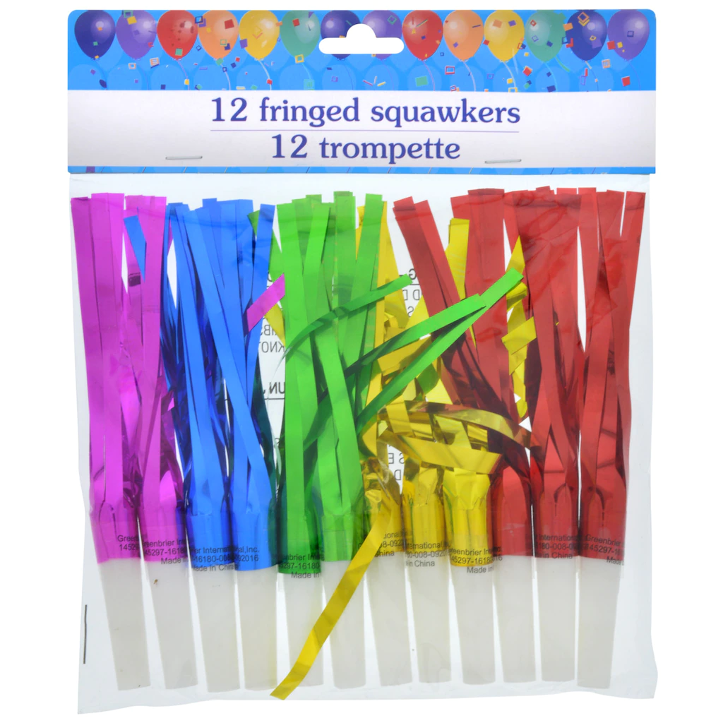 Assortment Details: 12-ct. packs of metallic fringe party squawkers. Each pack contains red, green, gold, purple, and blue.