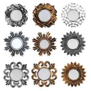 Assortment Details: 9.5×9.5-in. Mirrors with Decorative Frames assorted between gold and silver and among the 5 designs shown