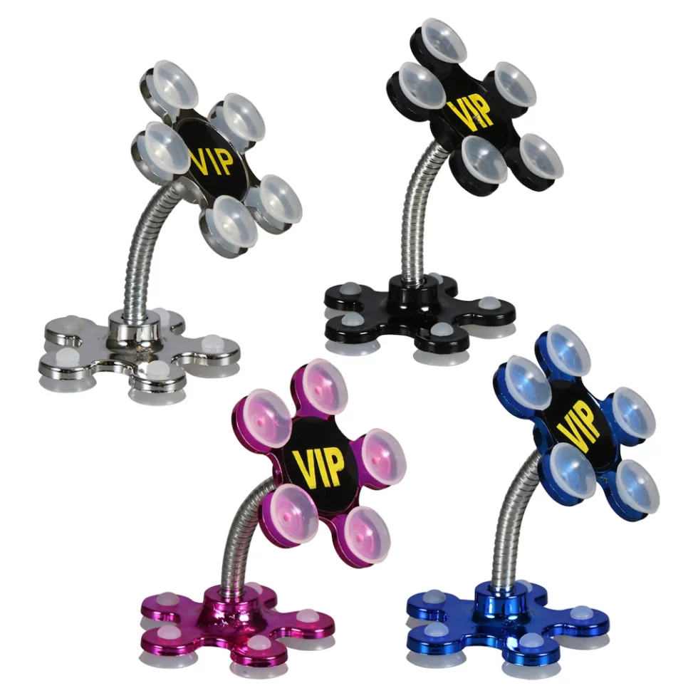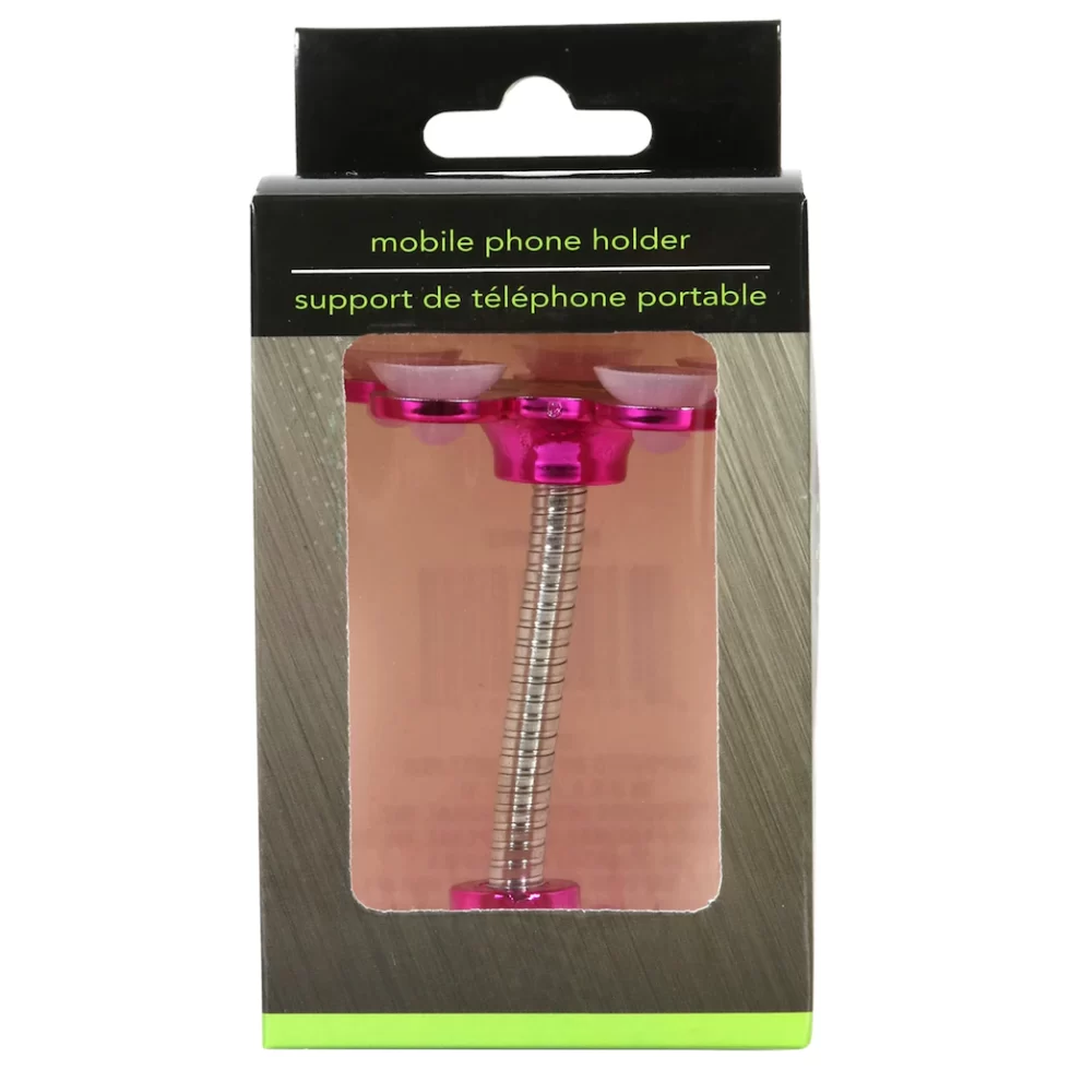Using small suction cups, these Mobile Phone Holders hold most mobile phones securely and at the angles your desired. They are assorted among pink, black, silver, and blue.