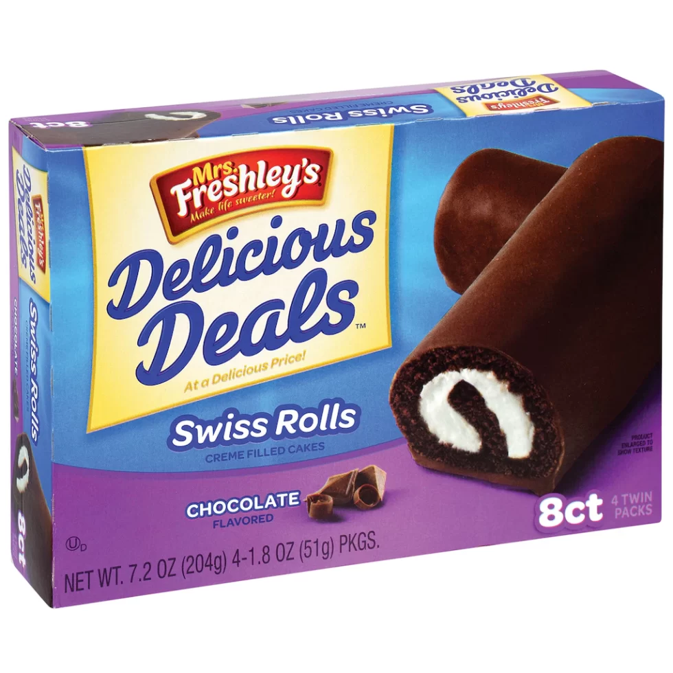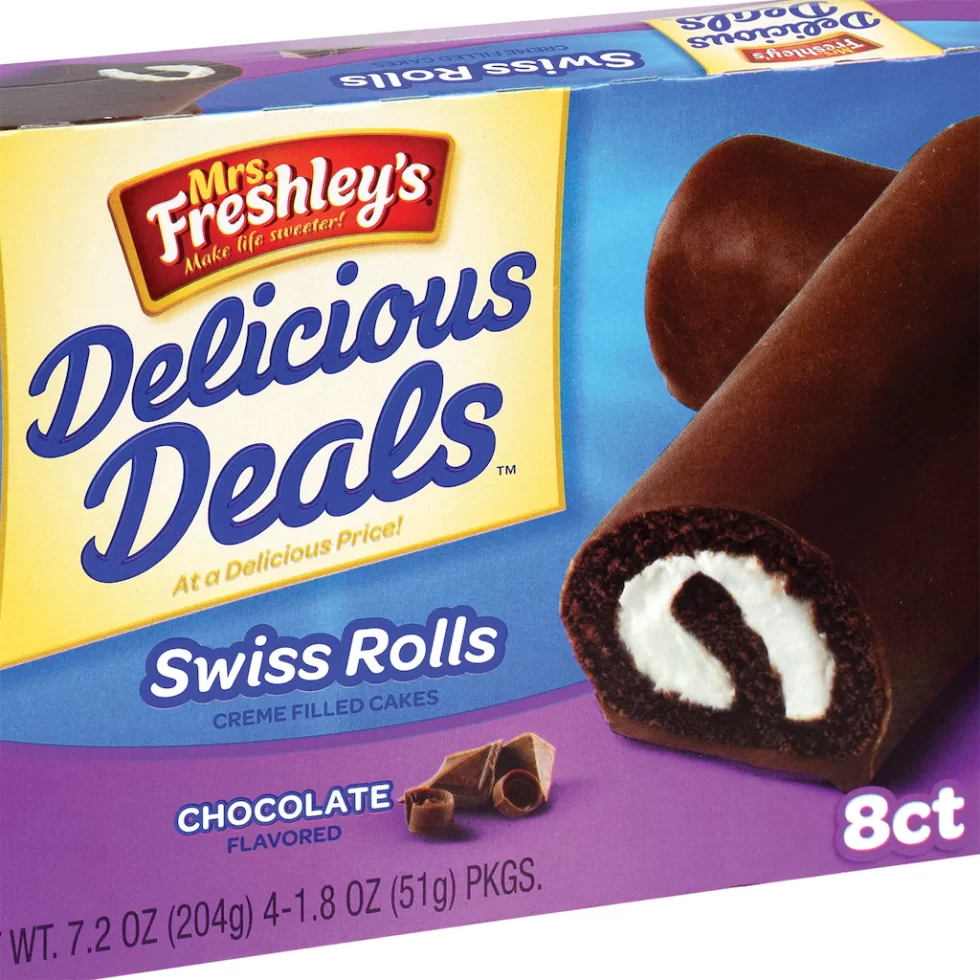 Assortment Details: 8-ct. Boxes Mrs. Freshley’s® Swiss Rolls