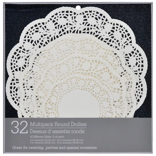 Assortment Details: 32-ct. Packs Multipack Round Paper Doilies in Assorted Sizes: 6-in., 8-in., 10-in., and 12-in.