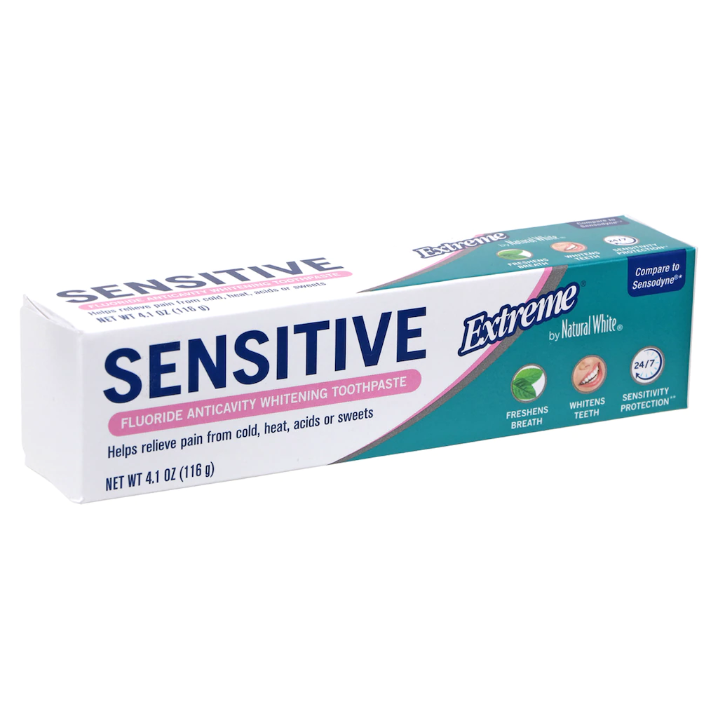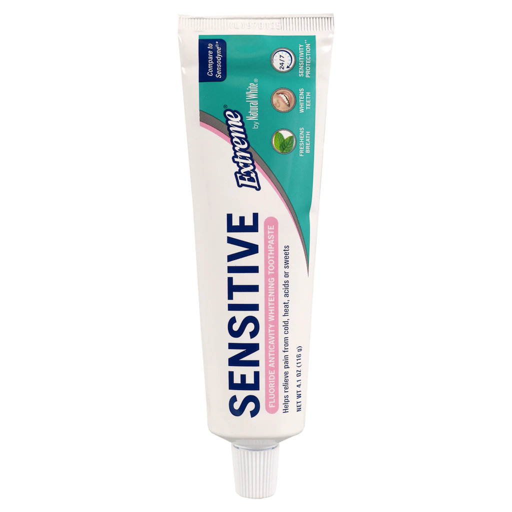 Natural White® Extreme® Sensitive Fluoride Anticavity Whitening Toothpaste is a great choice for whitening sensitive teeth! This toothpaste freshens breath while helping relieve pain from cold, heat, acids, or sweets. Each 4.1-oz. tube measures 6.875×1.75 in. Ideal for your home and including in care packages!