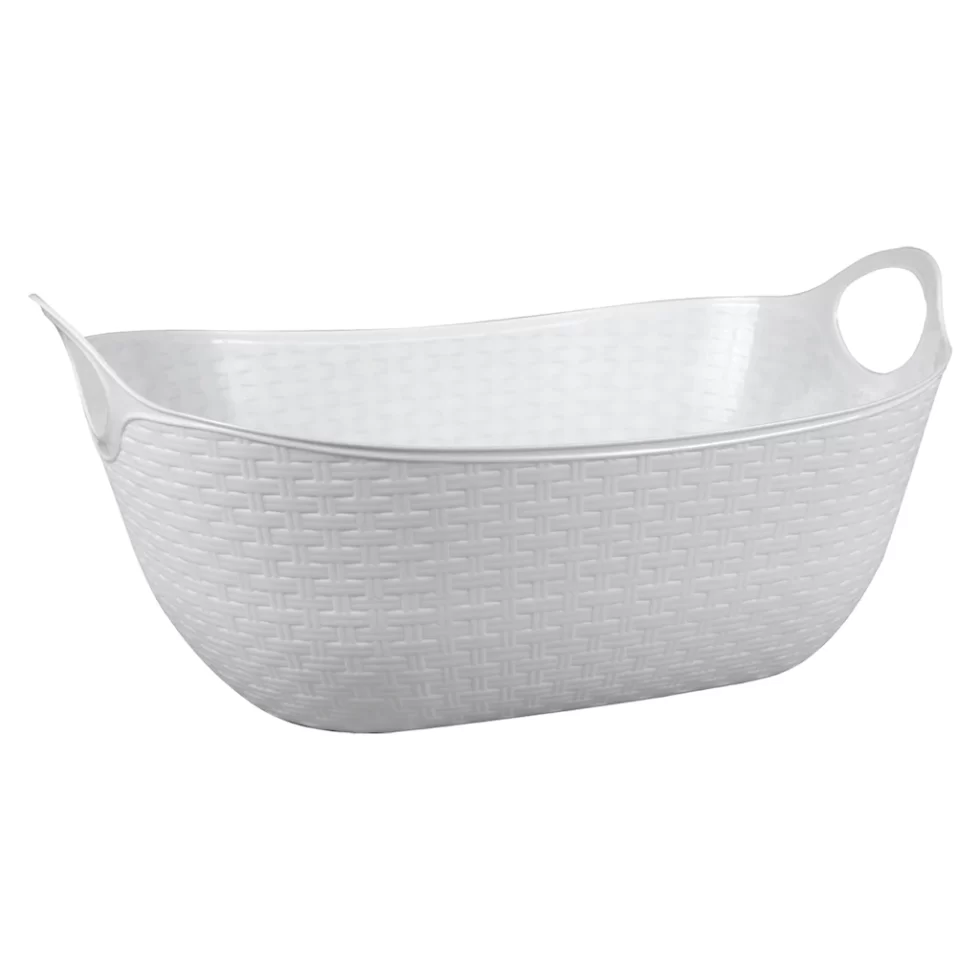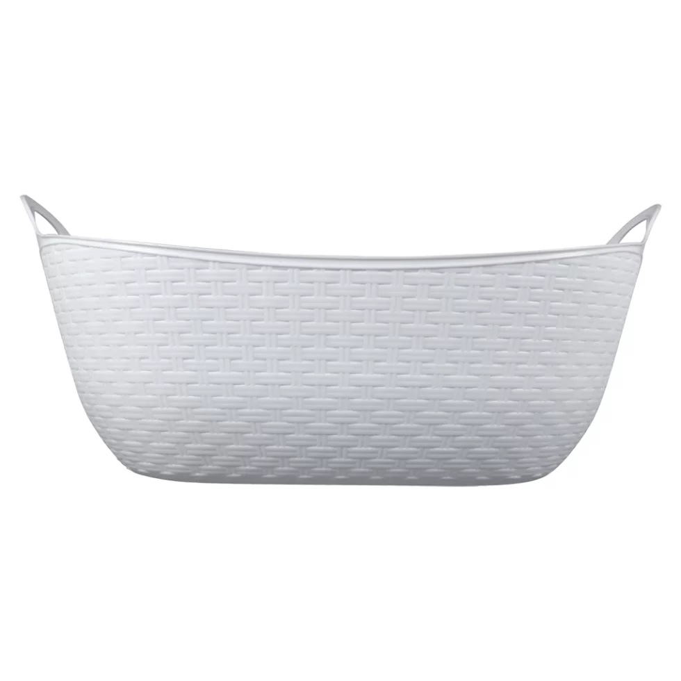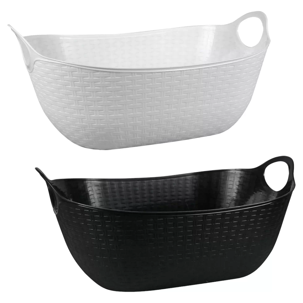 Carry your items around the home in a baskets made of sturdy plastic. They measure 16.5×11.5×7.5-in. and have a chic rattan appearance that attracts the eye. Colors are assorted between black and white and every baskets comes with loop handles making carting from place to place much easier.