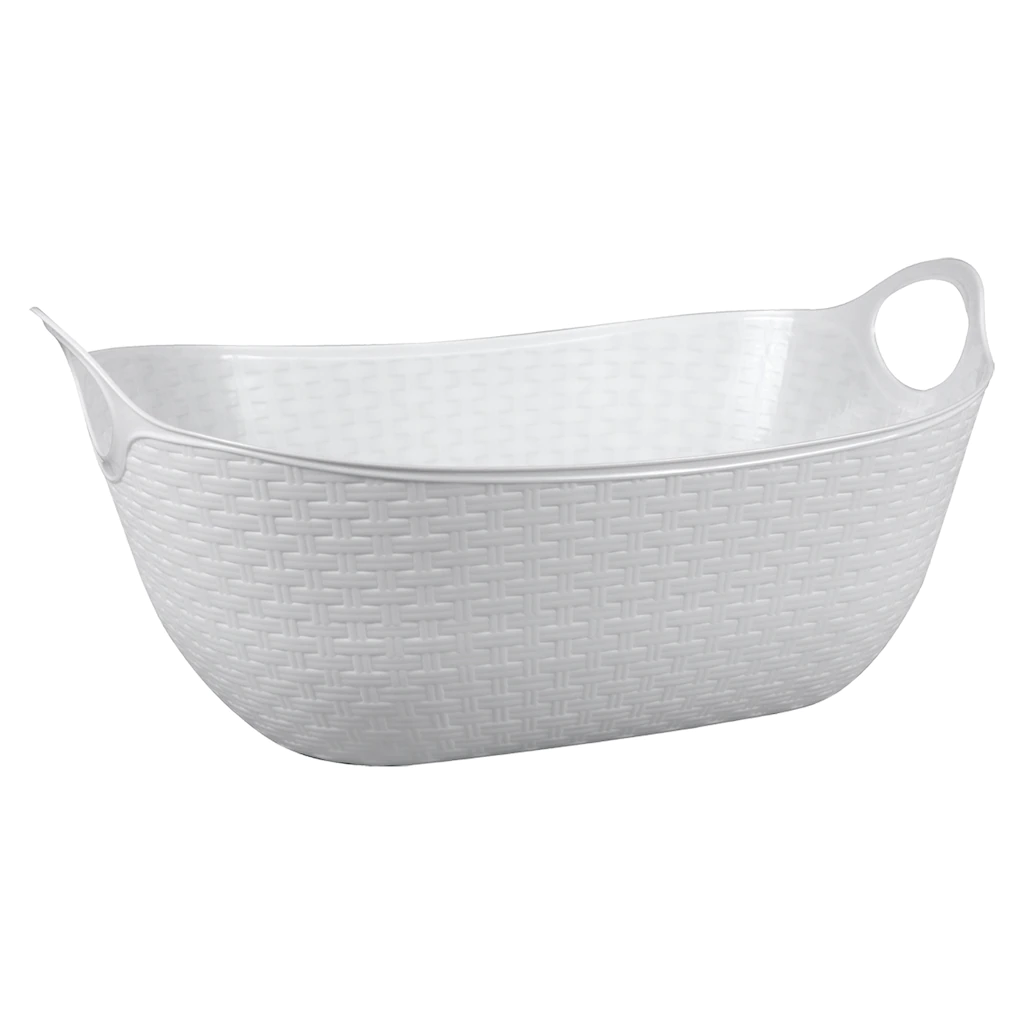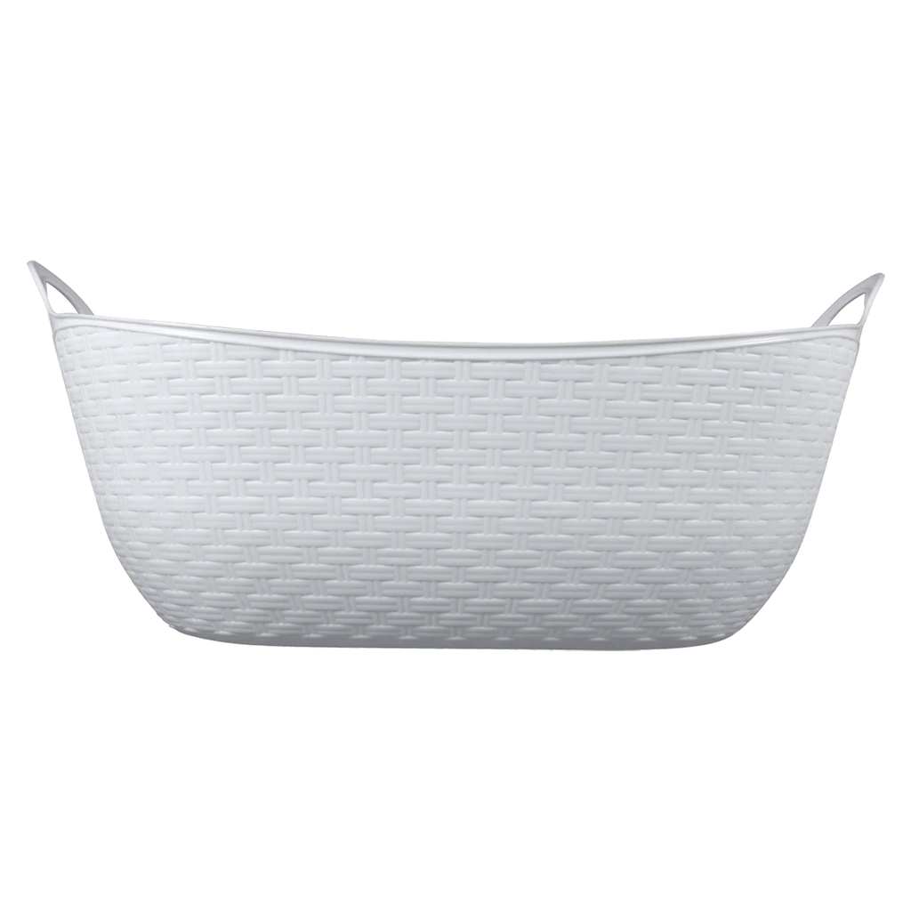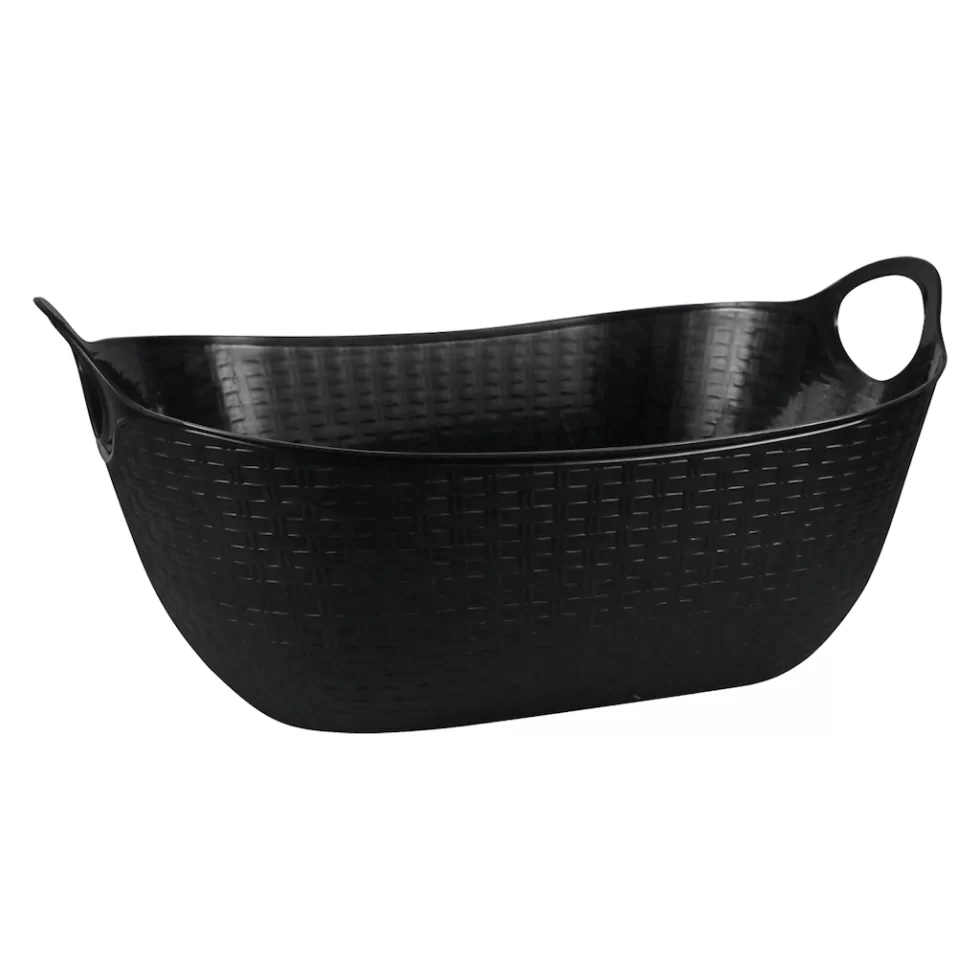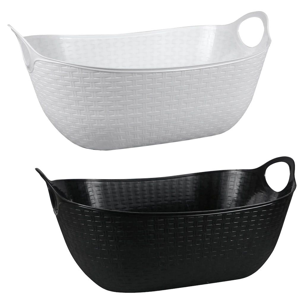 Assortment Details: 16.5×11.5×7.5-in. Oval Contour Rattan Baskets with Loop Handles assorted between black and white