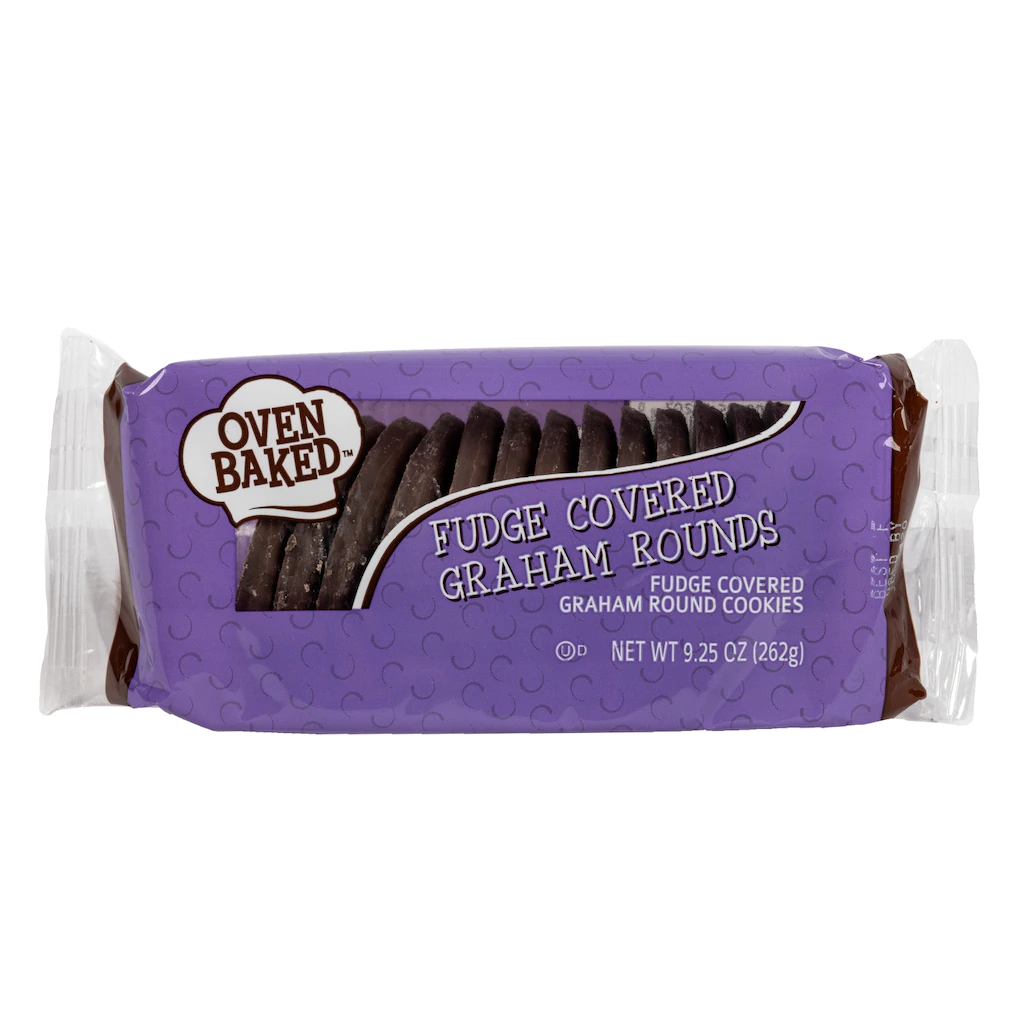 Warm cookies for you and your friends and family to enjoy! 9.25-oz. packs of fudge covered graham rounds by Oven Baked™ will satisfy your hunger and sweet tooth. Excellent for your home, parties and sleepovers, snacking throughout the day, stocking stuffers, and resale in grocery or convenience stores.