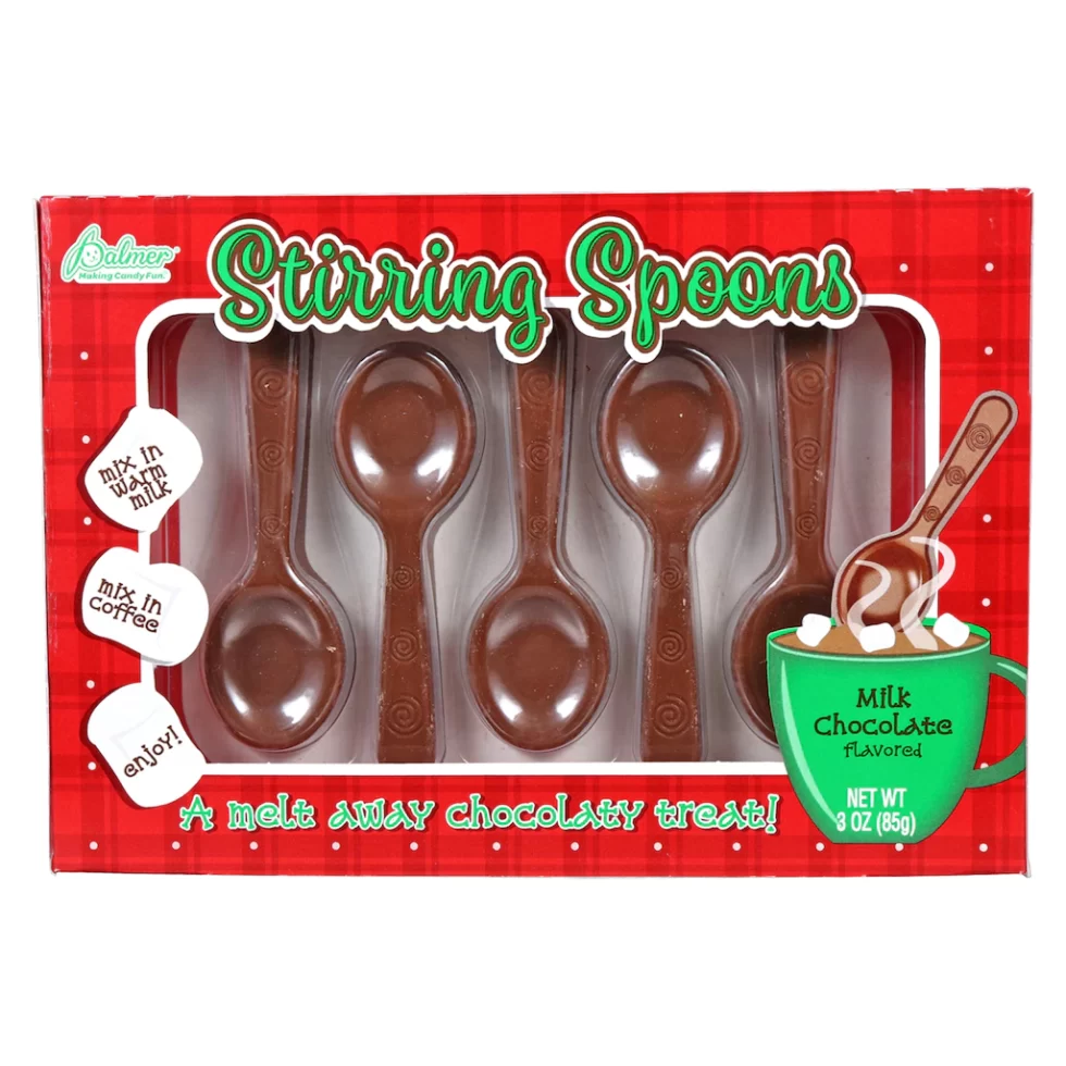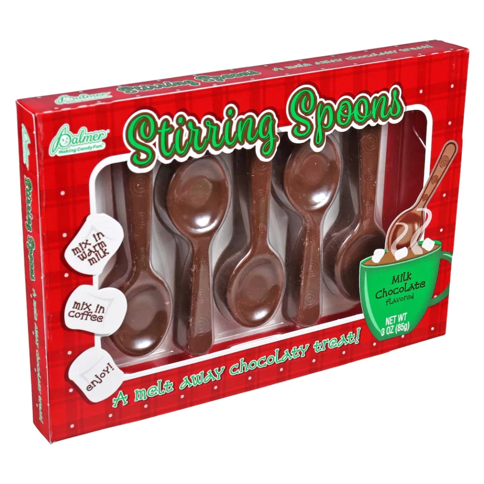 Palmer’s delicious chocolatey stirring spoons are perfect for any movie night, game night or sitting outside in the cool weather around the fire-pit with some hot cocoa. Watch these chocolatey spoons melt and pump up the chocolate flavor! Heat up some milk and stir this chocolate flavor right in. There are 5 chocolatey spoons in each pack.