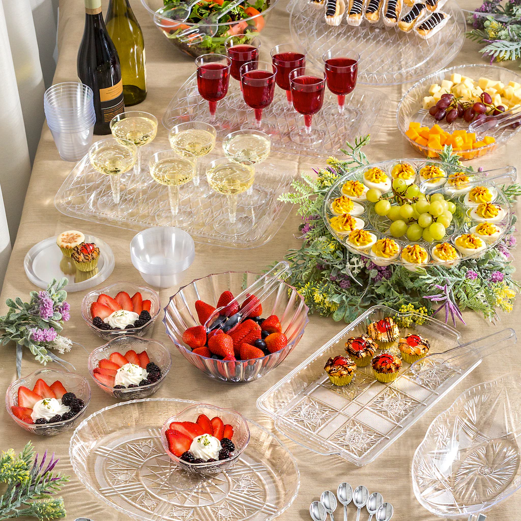 The look of crystal in convenient and disposable plastic! Adorned with elaborate detail, these elegant plastic salad bowls are perfect for serving salads, side dishes, fruit, cereal, or desserts. 4-ct. packs of 5×2.75-in. salad bowls are great for home use, restaurants, banquet halls, caterers, resale in kitchen supply stores, and more.
