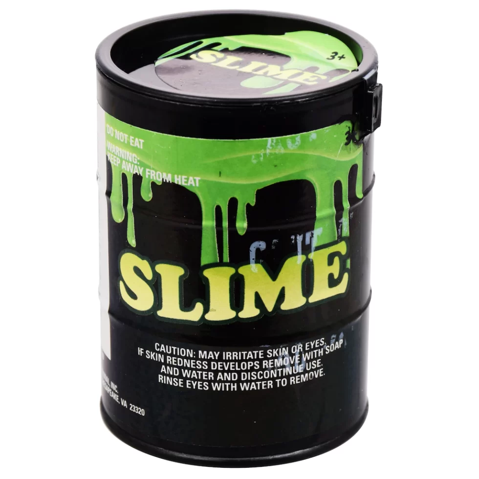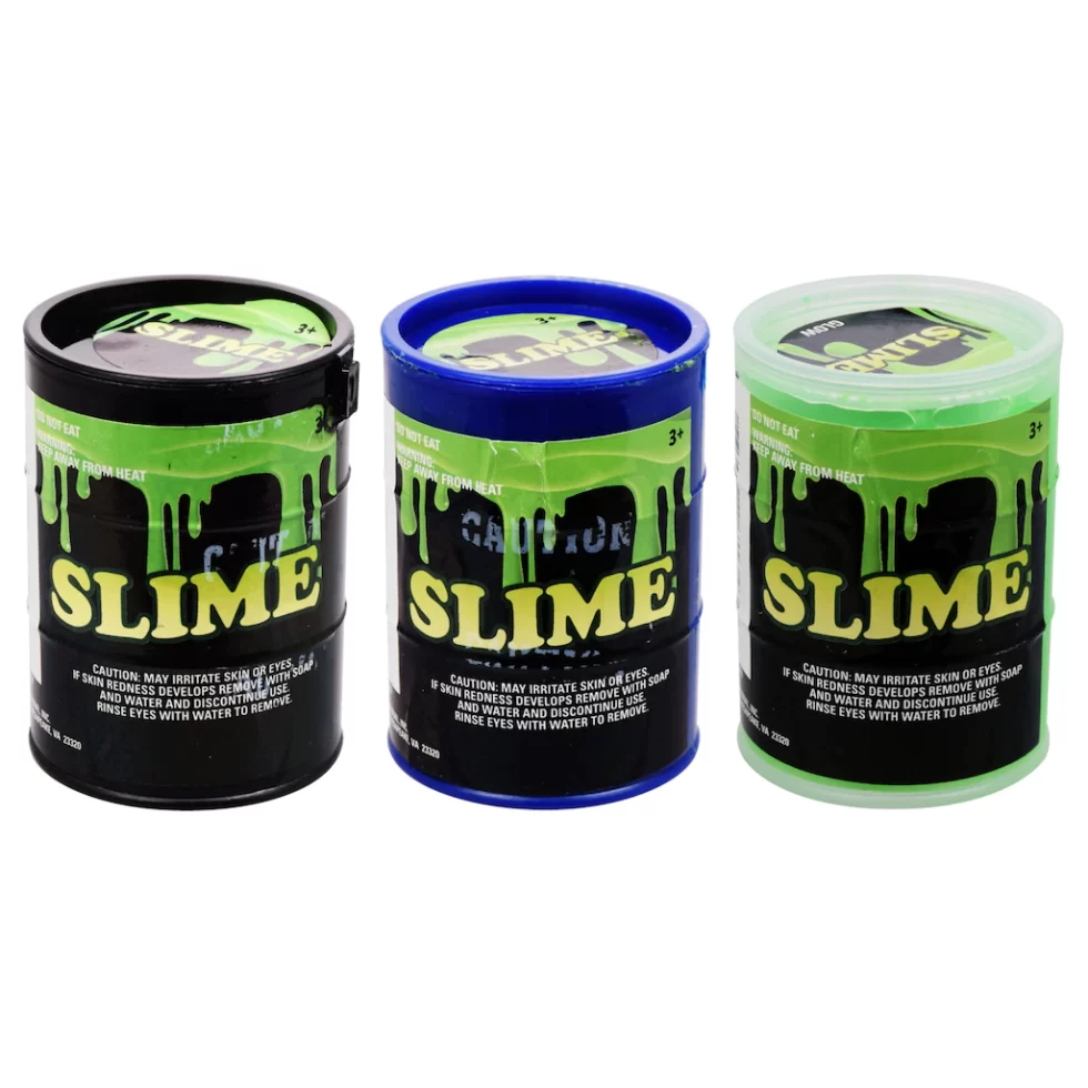 Slippery, gooey slime will keep you and the kids entertained for hours! Each 2×3-in. mini plastic oil drum comes filled with one of 3 different colors of slime: glow-in-the-dark green, glow-in-the-dark blue, or black. Ideal for prize boxes, party favors, goodie bags, and resale. Ages 3+.