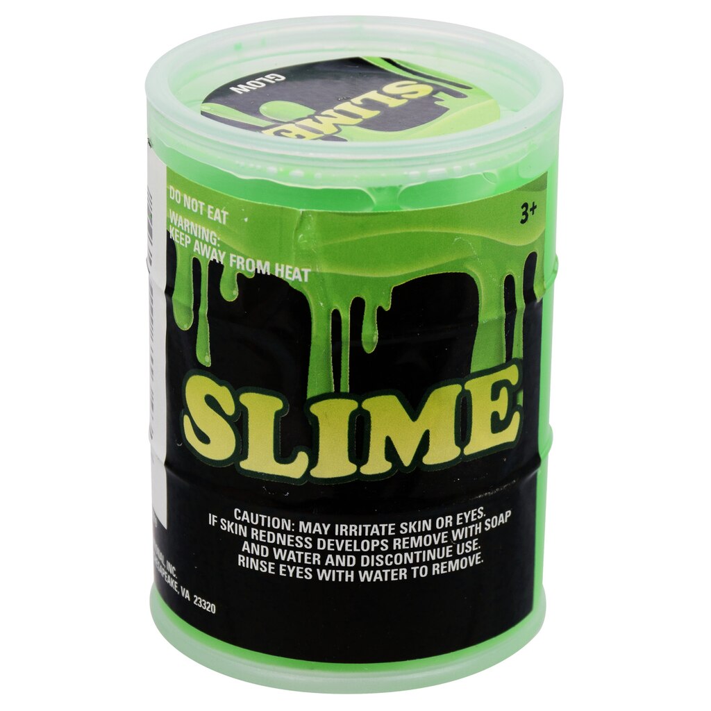 Assortment Details: 2×3-in. Plastic Drums of Play Slime assorted among black, glow-in-the-dark blue, and glow-in-the-dark green