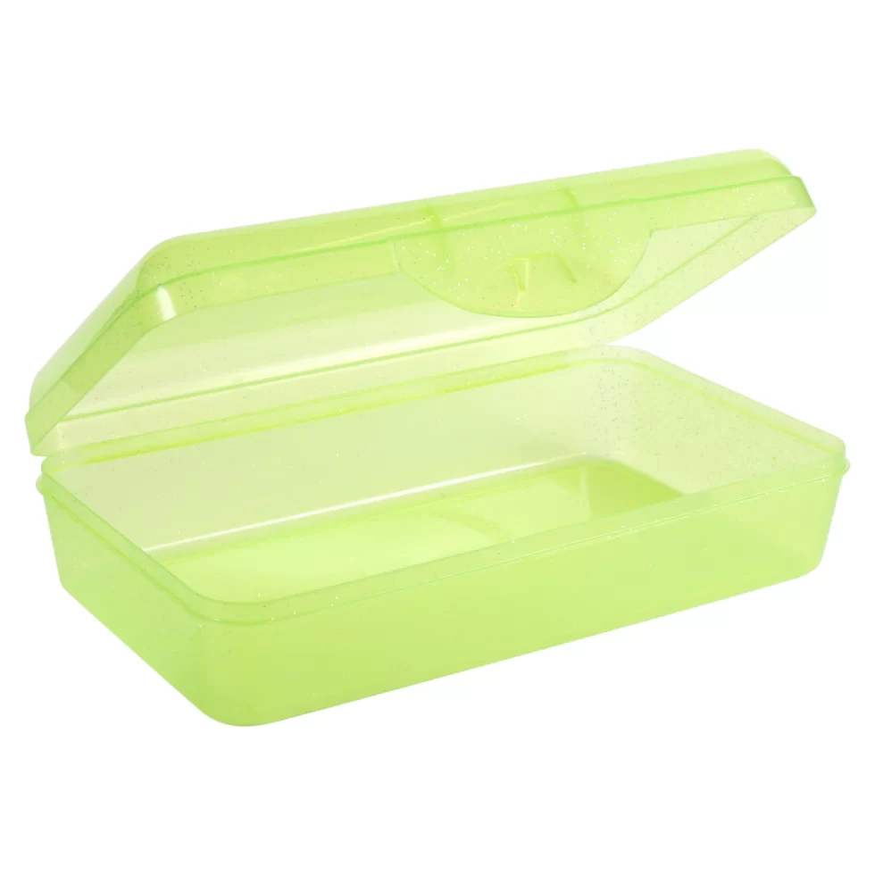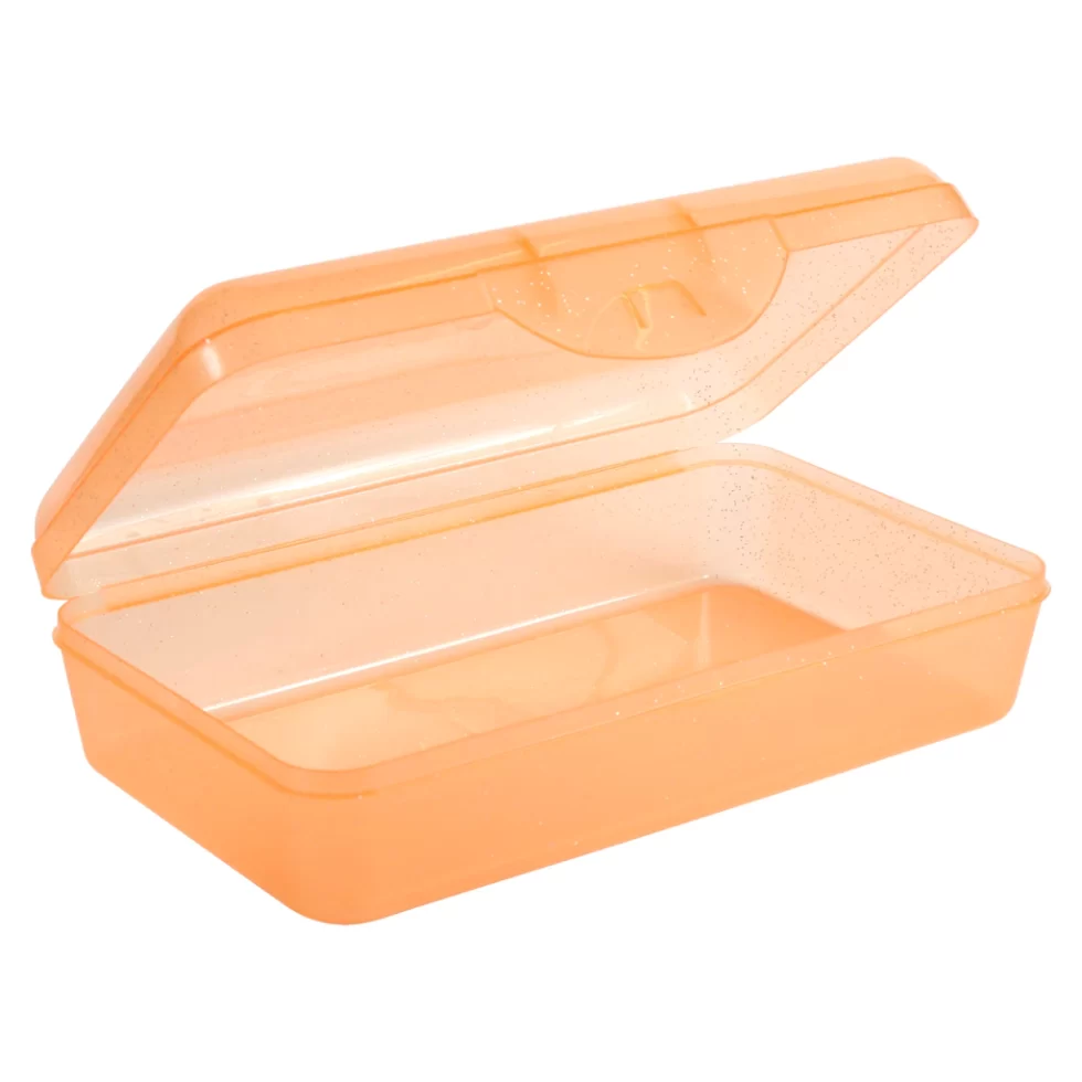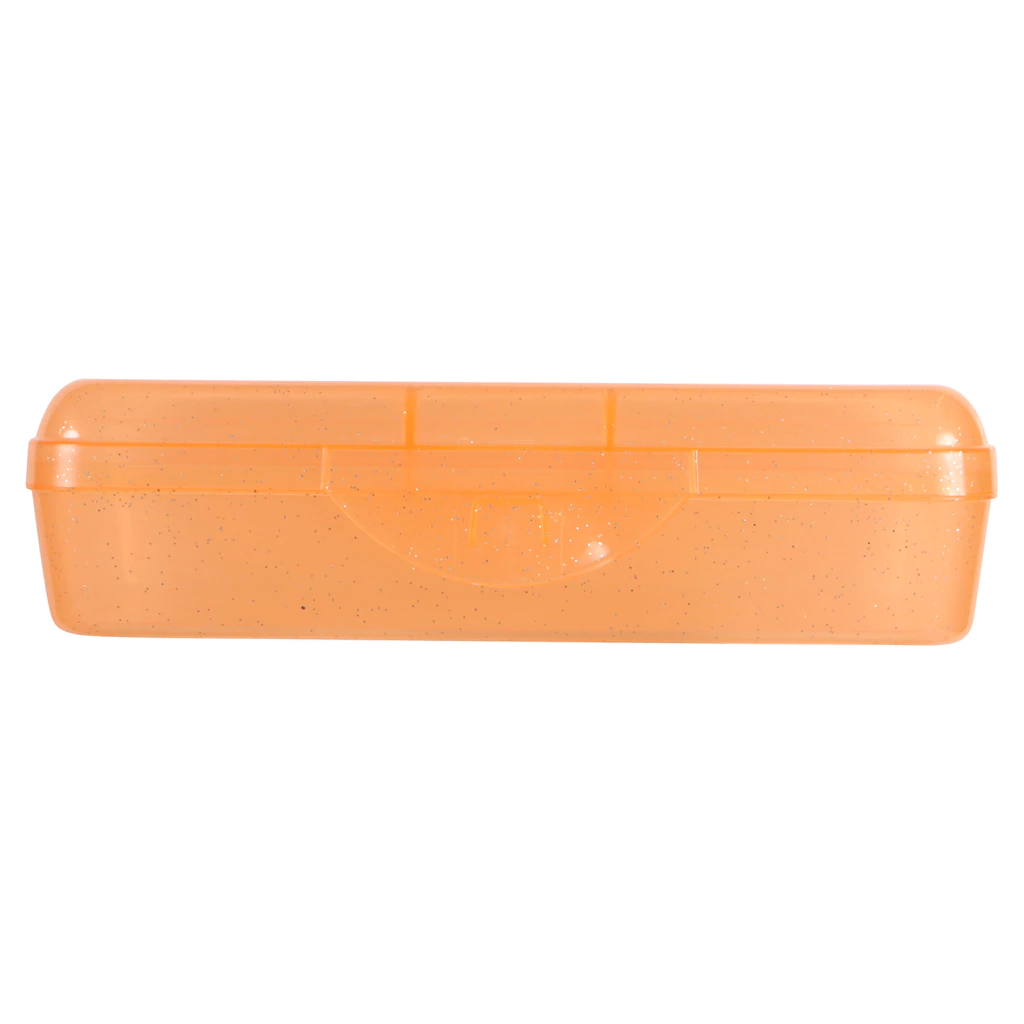 Assortment Details: 8x5x2.25-in. Plastic Glitter Pencil Boxes assorted among lime green, pink, blue, and orange.