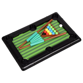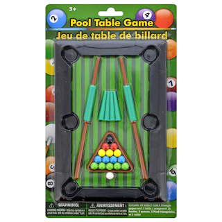 The perfect gift for every pool shark! Tabletop billiards game measures 8.5-in. long and 5.75-in. and and is portable enough to set up almost anywhere. Includes two plastic spring-loaded cues, 16 plastic balls, rack, and 4 mini table legs. Great for parties, halftime recreation, or just eliminating boredom at home. Ages 3+.