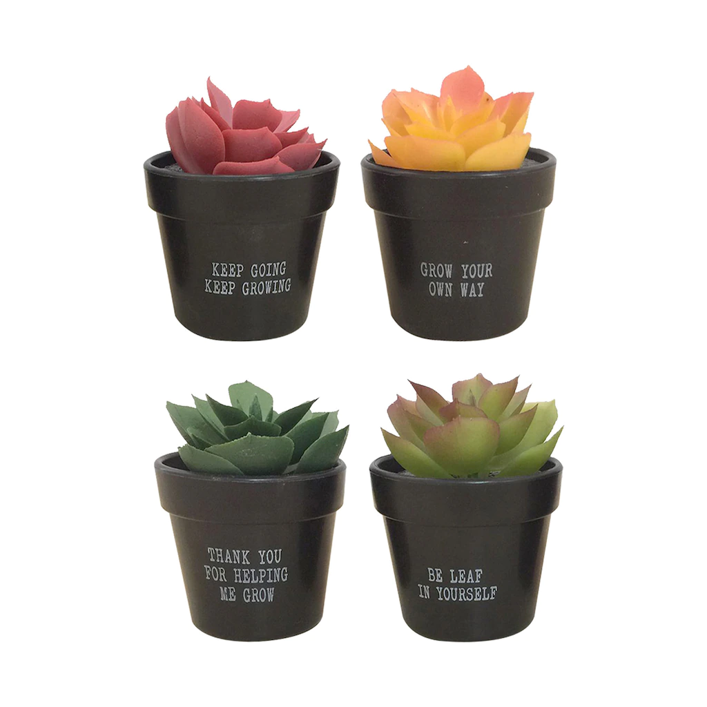 These faux potted succulents with sentiments are lovely to have in various spaces and also make wonderful gift items. They are assorted among “Keep Going Keep Growing,” “Grow Your Own Way,” “Thank you for Helping me Grow,” and “Be Leaf in Yourself’