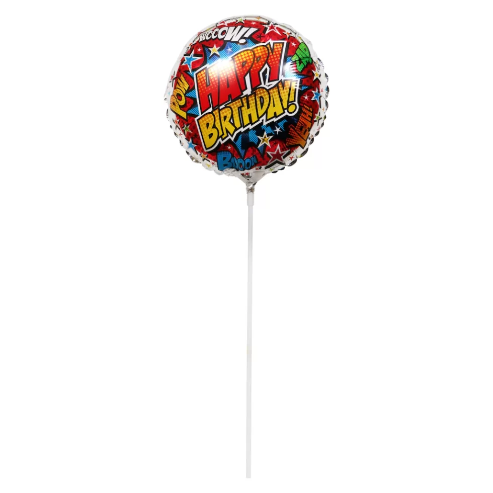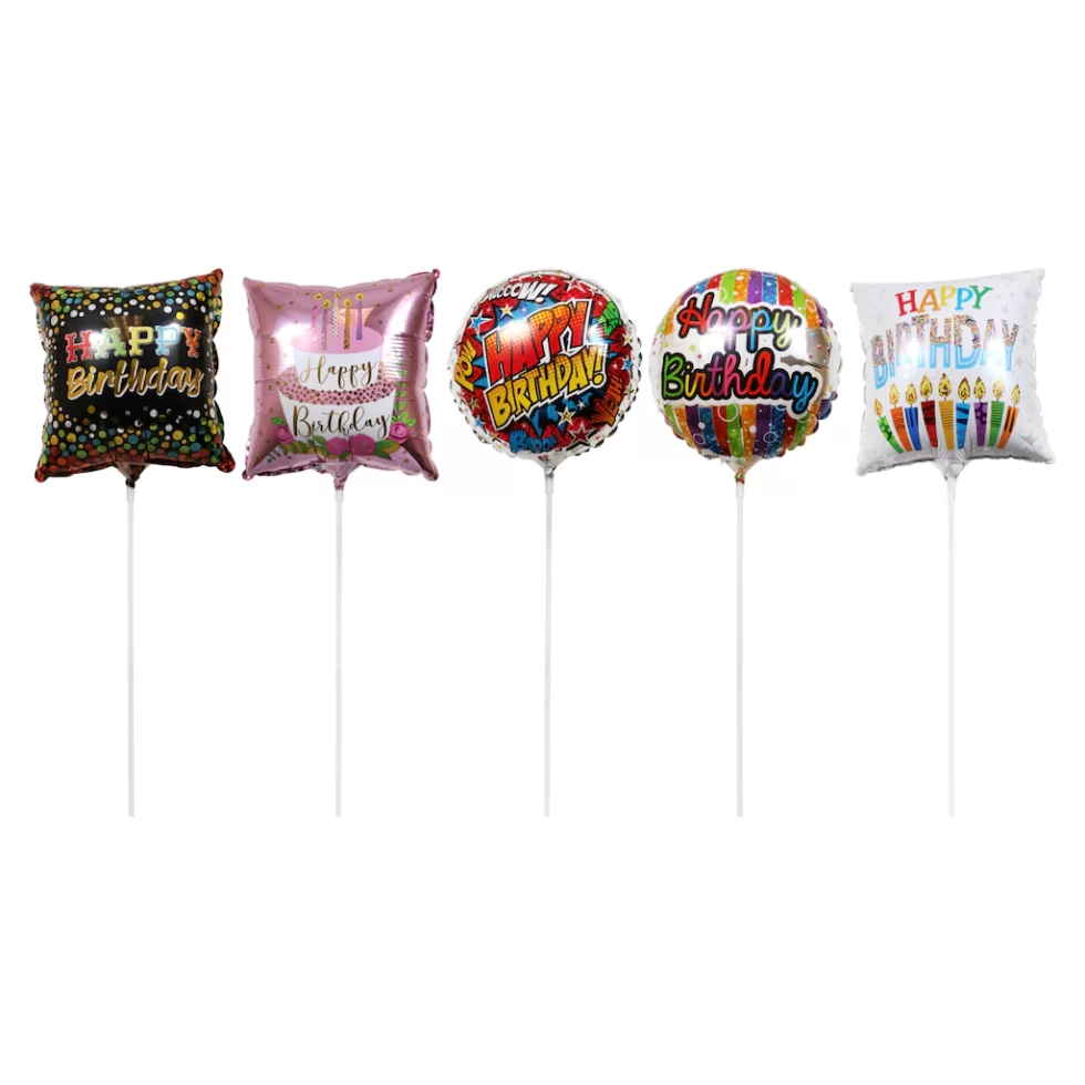 Assortment Details: Pre-Inflated Foil Birthday Balloons with picks assorted among the 5 designs shown.