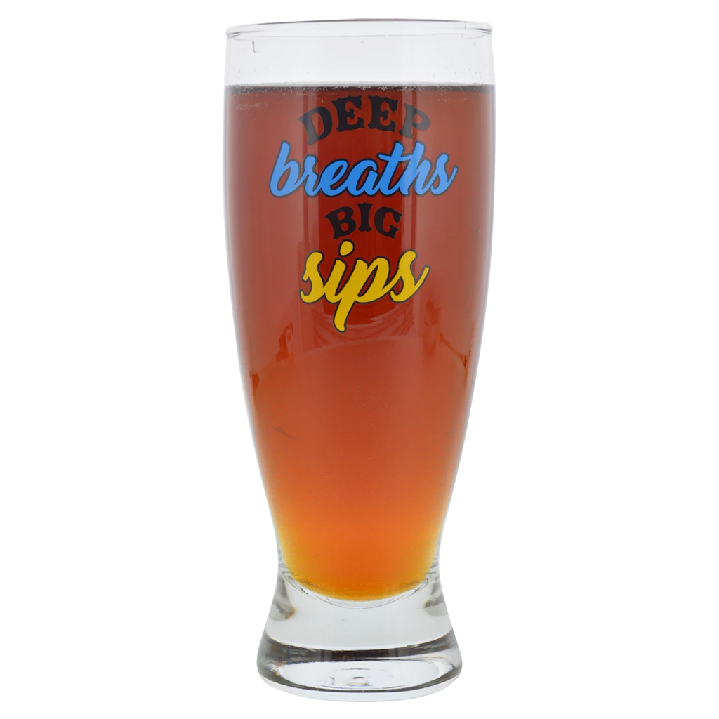 Tapered pilsner glasses have a thick, sturdy base and are ideal for serving up ice cold beers! Each glass is also printed with “Deep Breathes, Big Sips”. They are perfect for restaurants, bars, and caterers.