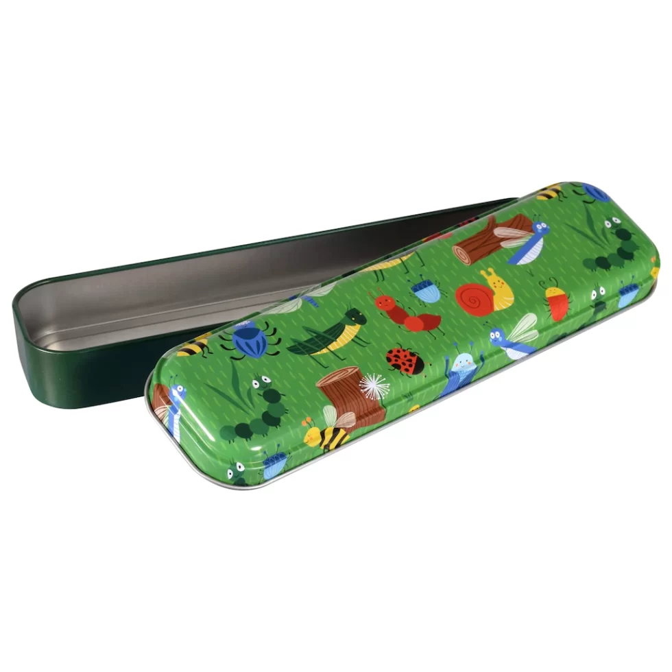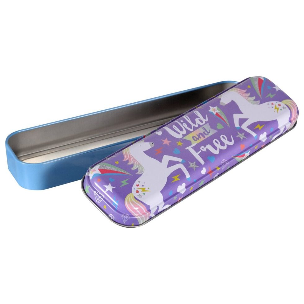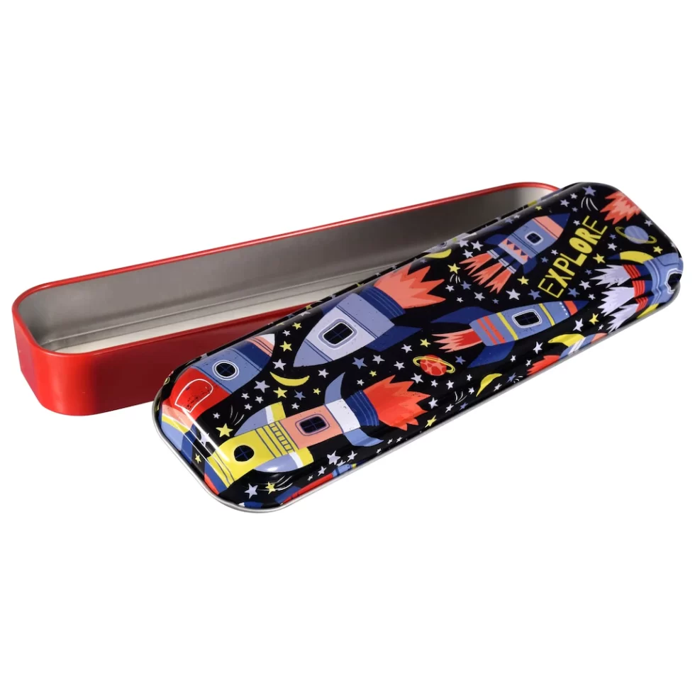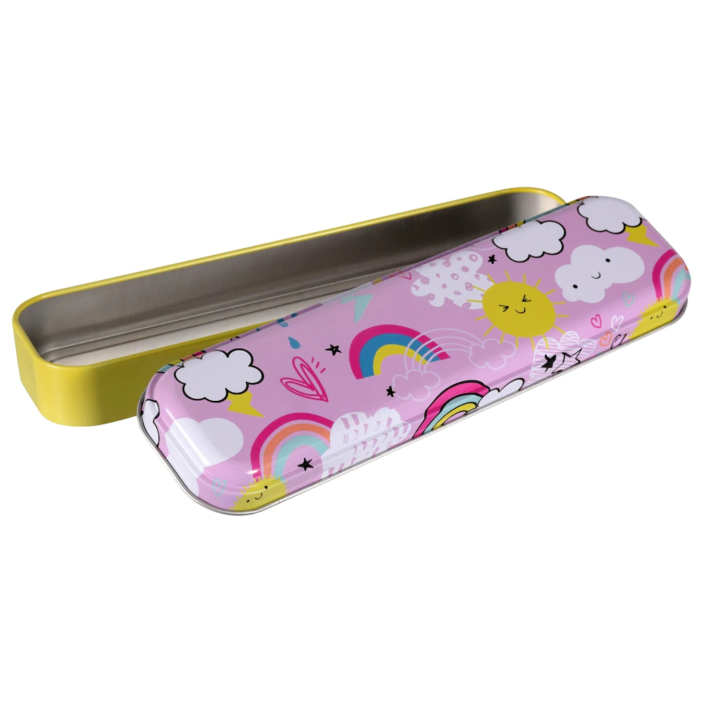 Have all your school or office pens and pencils kept together in one of these organized tin containers. Printed and colorful pencil boxes measure 8x2x1-in. and come assorted among the 6 designs shown. Perfect for resale in office supply stores, home goods stores, and super centers.