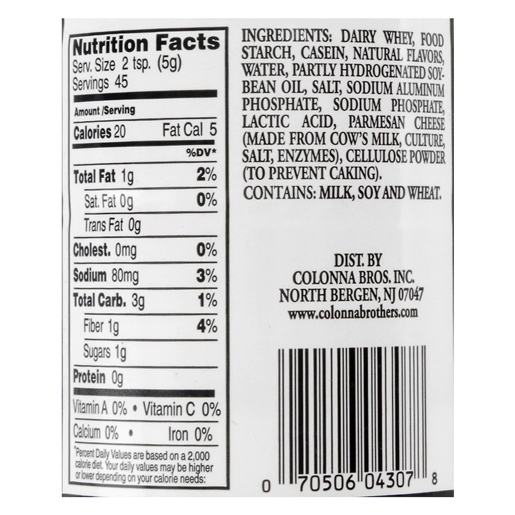Risparmio Grated Topping with Parmesan is perfect for your pizza, pasta, or salad! Each 8-oz. container has a two-sided flip-up lid and one side is wide enough for a spoon for precise measuring while the other is great for sprinkling on top of your favorite dish. A great addition to your pantry or restaurant and excellent for donating to care facilities and church pantries. Contains milk, soy, and wheat.
