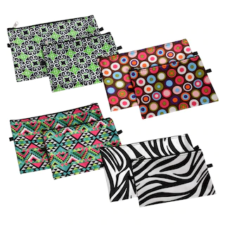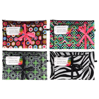 Assortment Details: 2-ct. Packs of Sassy+Chic® Zippered Cosmetic Bags assorted between sizes 4.5×6-in. and 5.25×8.25-in. and additionally assorted among the 4 styles shown.