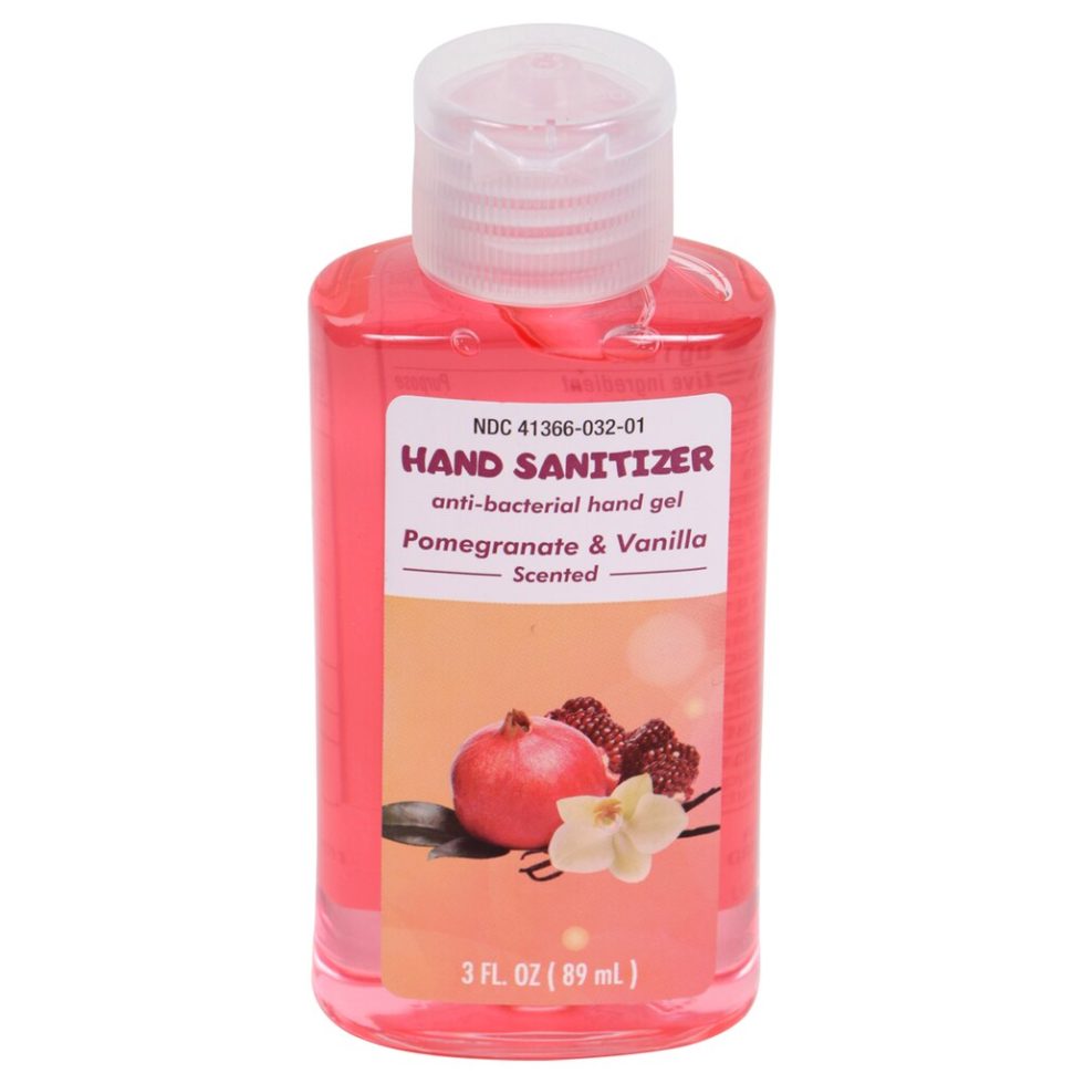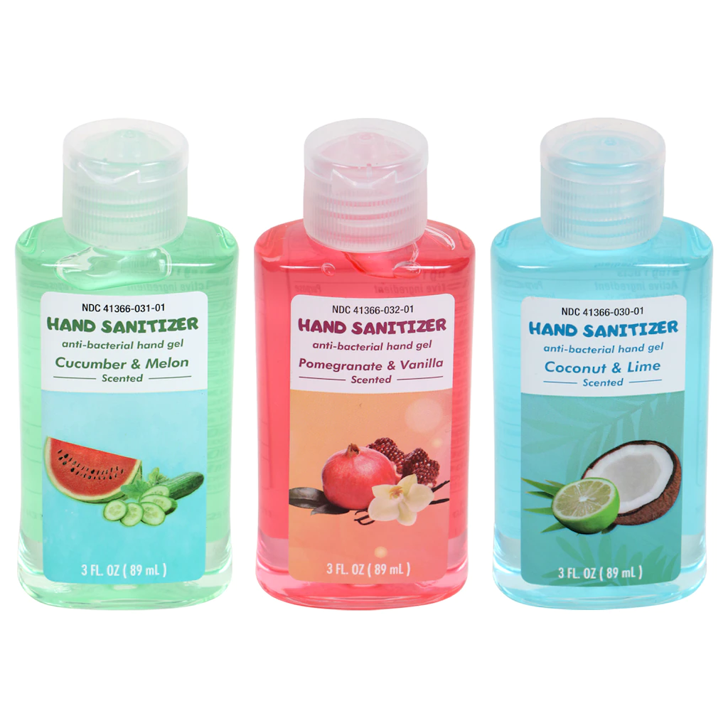 Assortment Details: Scented Hand Sanitizer assorted among cucumber and melon, pomegranate and vanilla, and coconut and lime scents